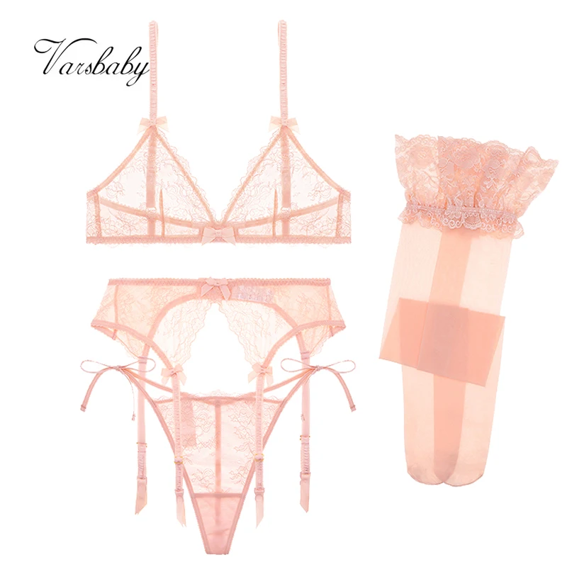 Varsbaby сексуальное удобное Прозрачное нижнее белье с глубоким v-образным вырезом комплект с кольцом без косточек для бюстгальтера + подвязки + стринги + чулки 4 шт.лот