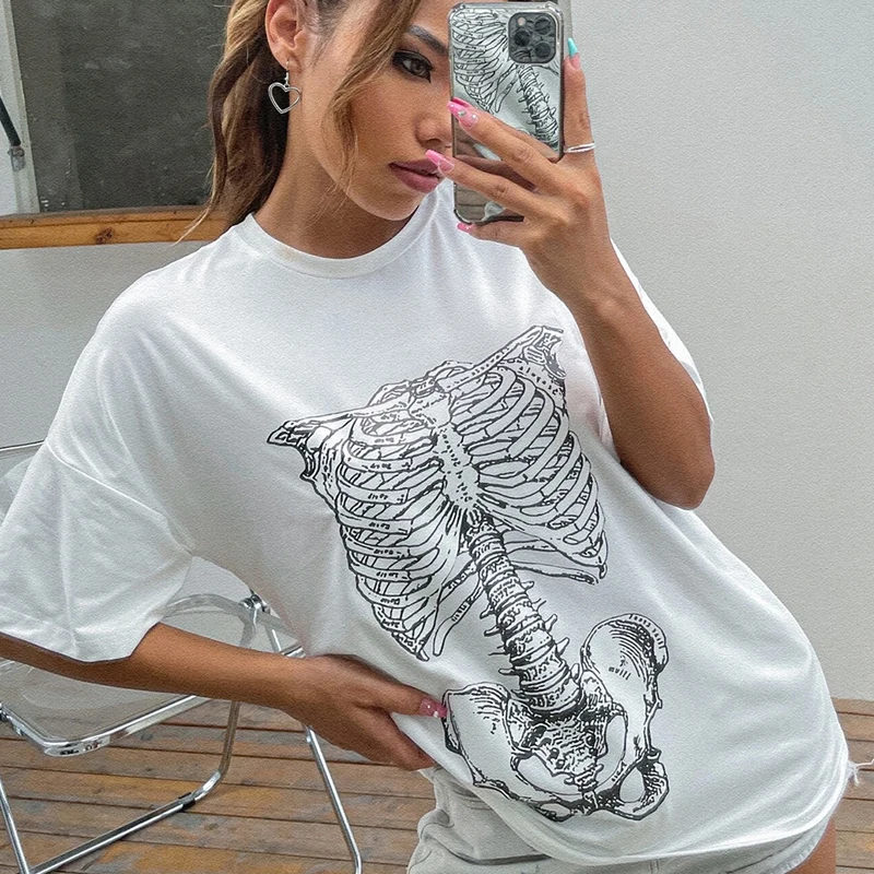 Футболка женская оверсайз с рисунком скелета, повседневный топ с коротким рукавом, уличная одежда, белый цвет, на лето