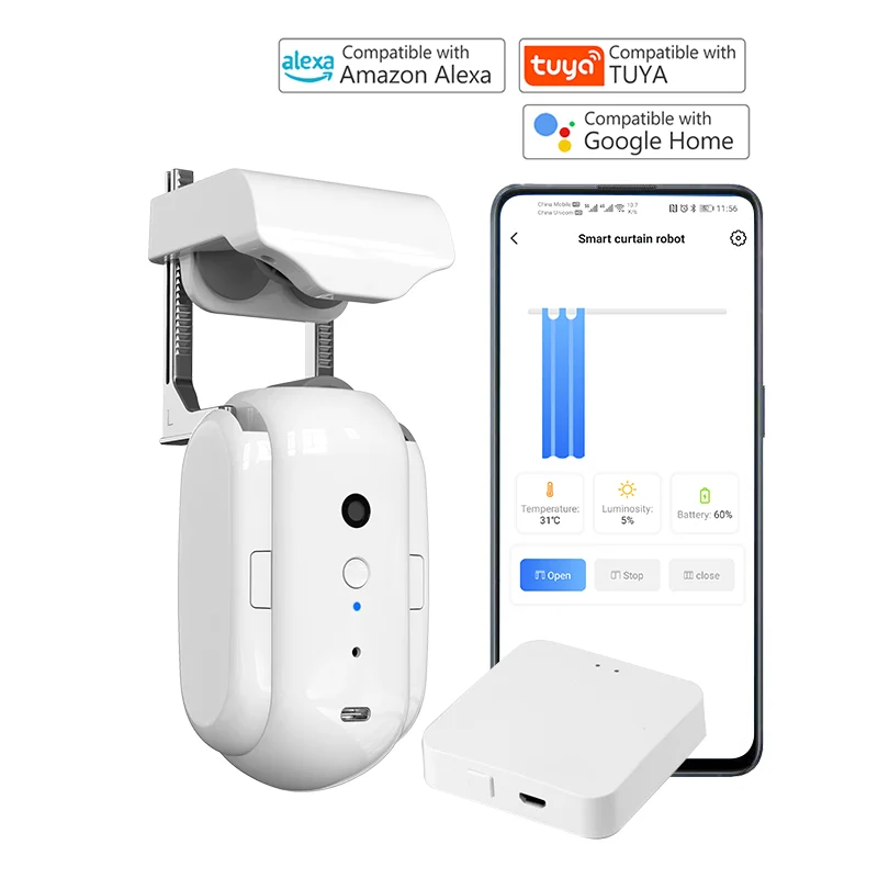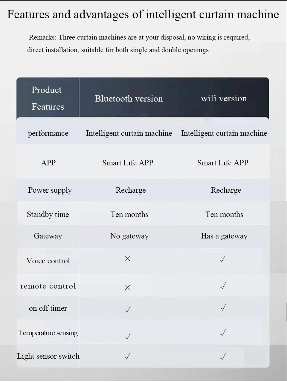 Прочная и бесшумная интеллектуальная машина для штор, без проводки, прямой установки, простой в эксплуатации, простой и удобный. Контроль продукта: (мобильный телефон Bluetooth, WiFi) занавес может автоматически открываться и закрываться.