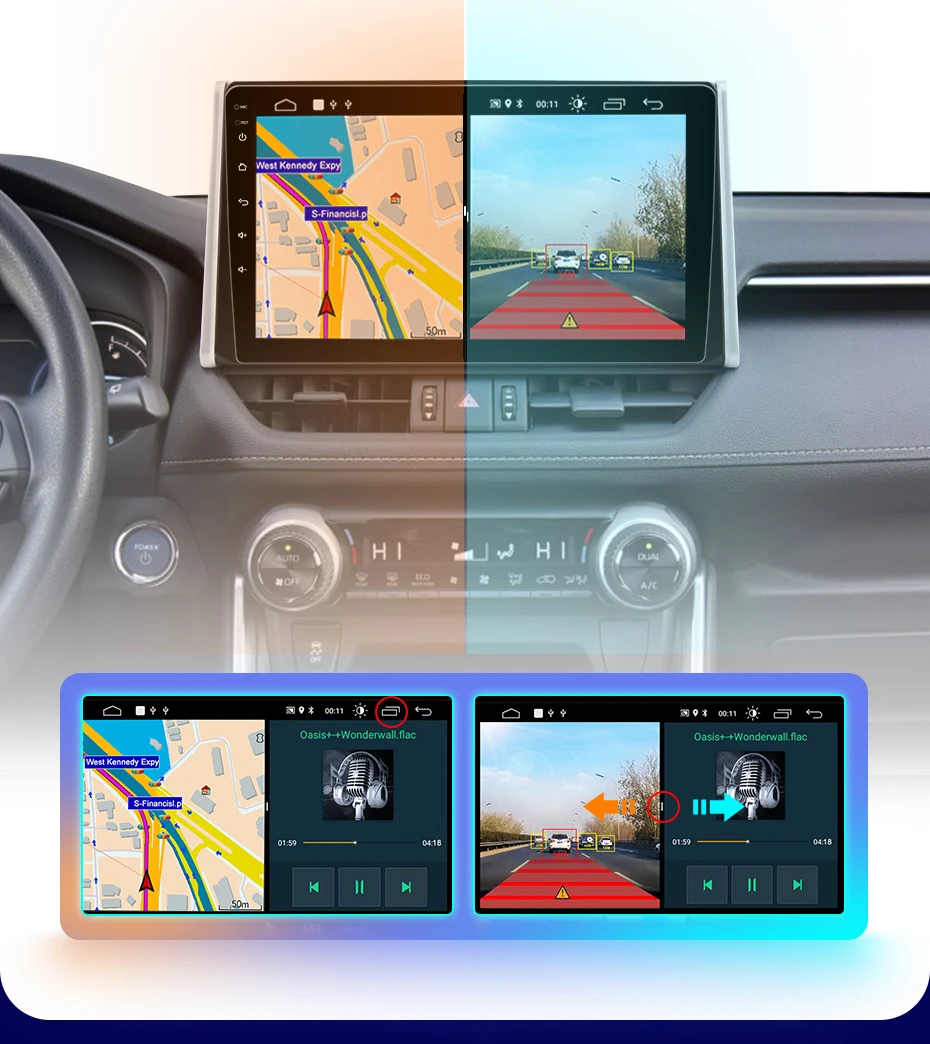 Радио поддерживает разделение экрана, вы можете использовать два приложения одновременно с этой функцией.(Только PX9s suppport)