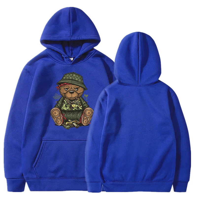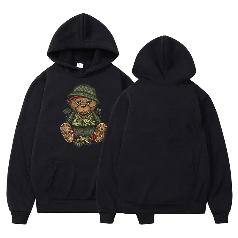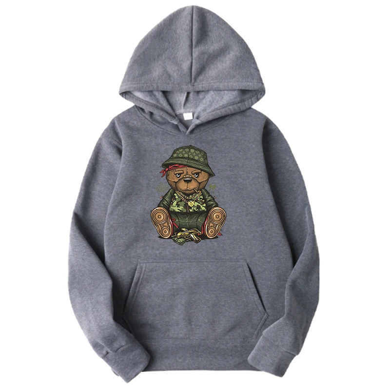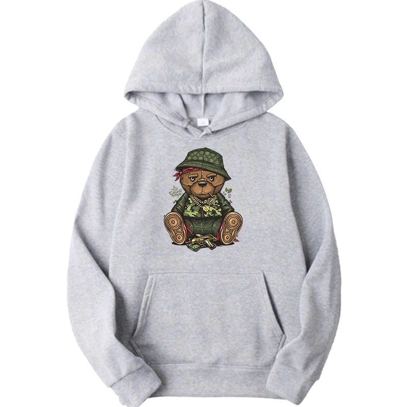 Толстовка мужская оверсайз с капюшоном, флисовый пуловер с длинным рукавом и принтом медведя, кофта в стиле хип-хоп, повседневный спортивный костюм для бега