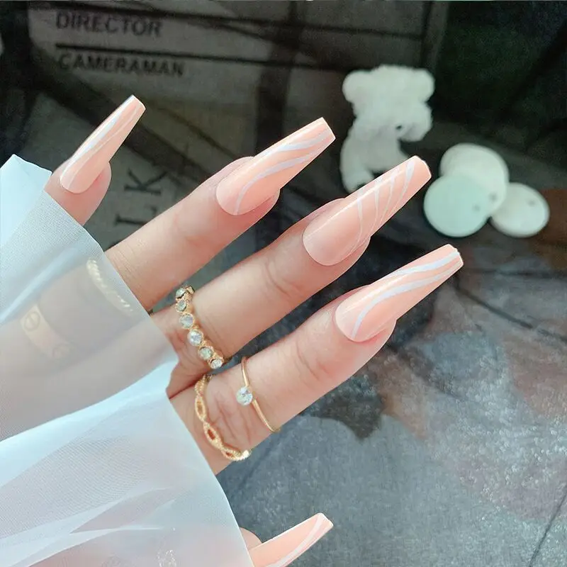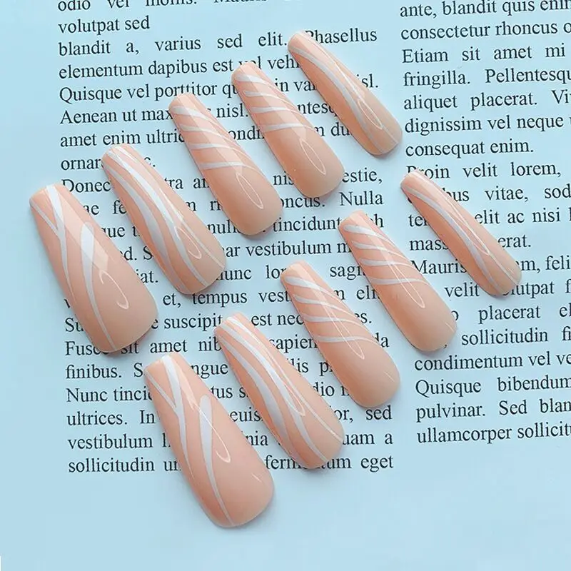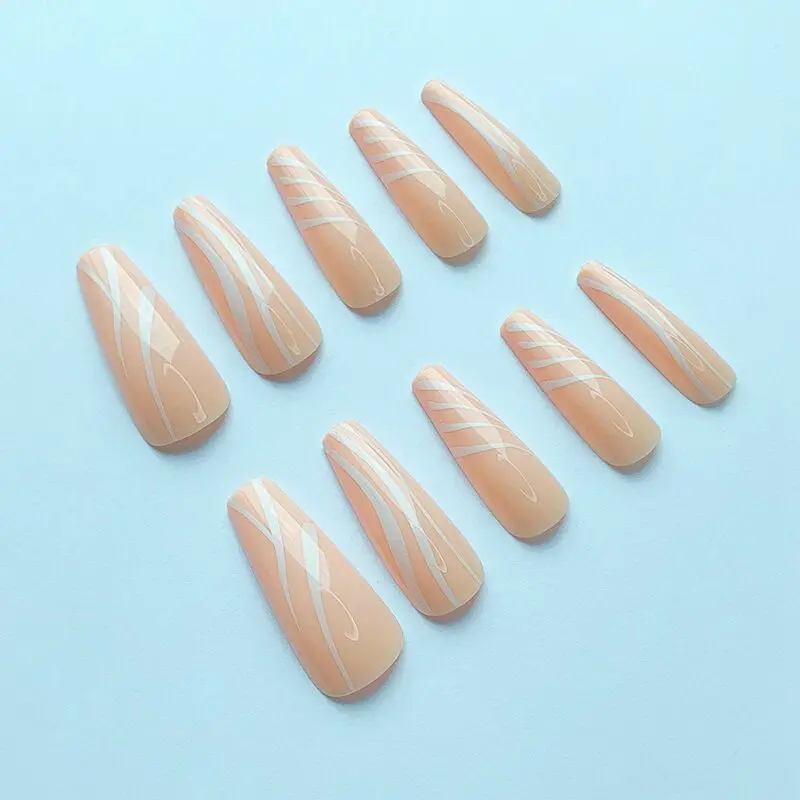 24 шт./компл. Длинные оранжевые накладные ногти геометрические искусственные балерины белые полоски гроб накладные ногти с клеем ногти для макияжа