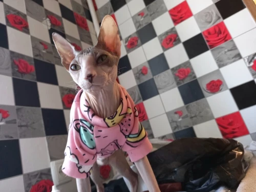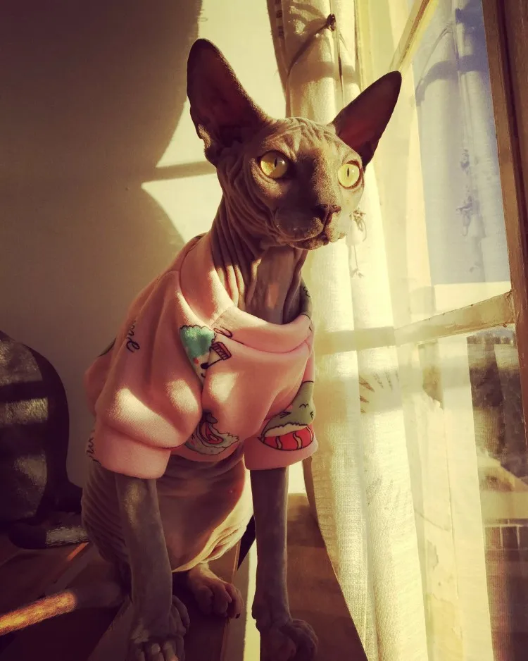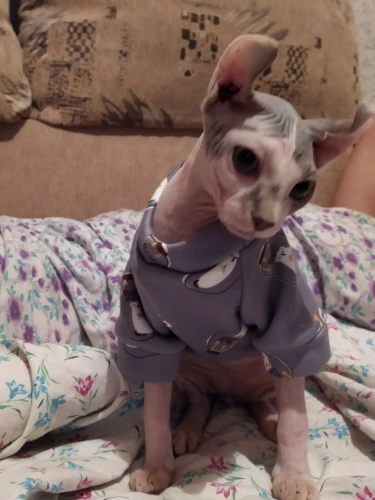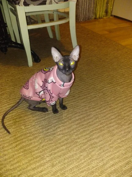 На кота канадского сфинкса размер s как раз , но по длине короткий как топик . И капюшон неудобный . Маловат