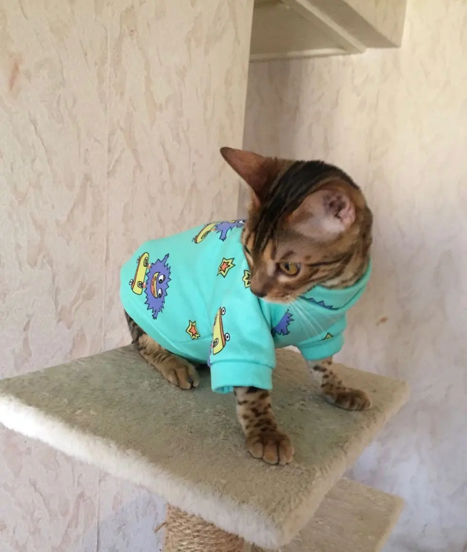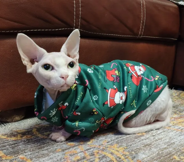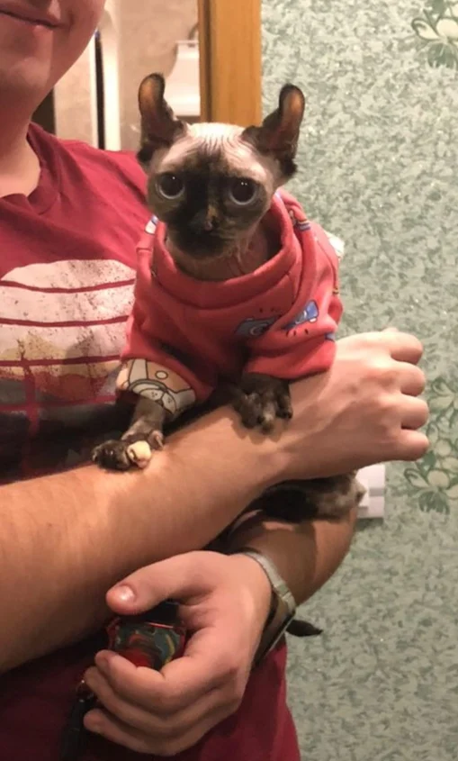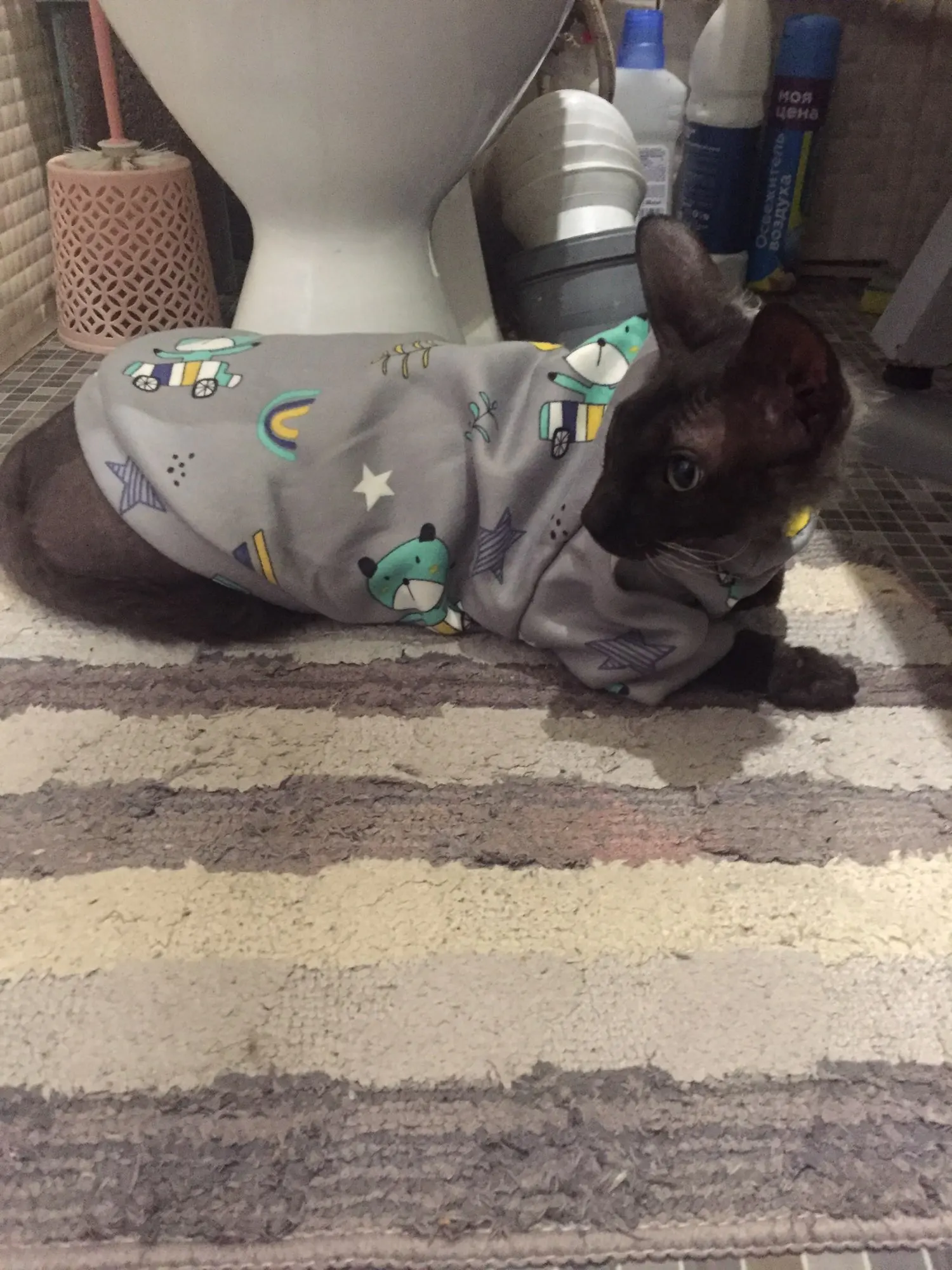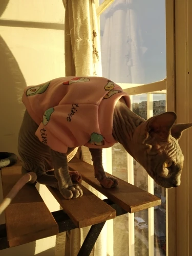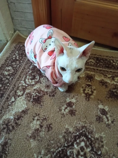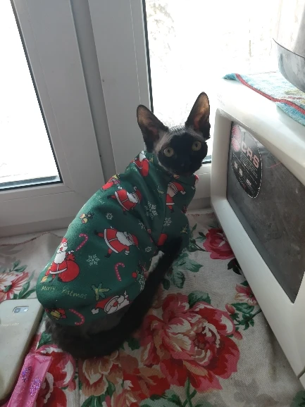 Кофточка мягкая, шовчики ровные, нитки не торчат. Есть небольшой запах, но как от новой вещи, после стирки должен уйти. Но ошиблась в размере. Кот донской сфинкс, по полноте все хорошо! А в длину надо было побольше размер взять длина спины 30 см Заказала S ..надо было L