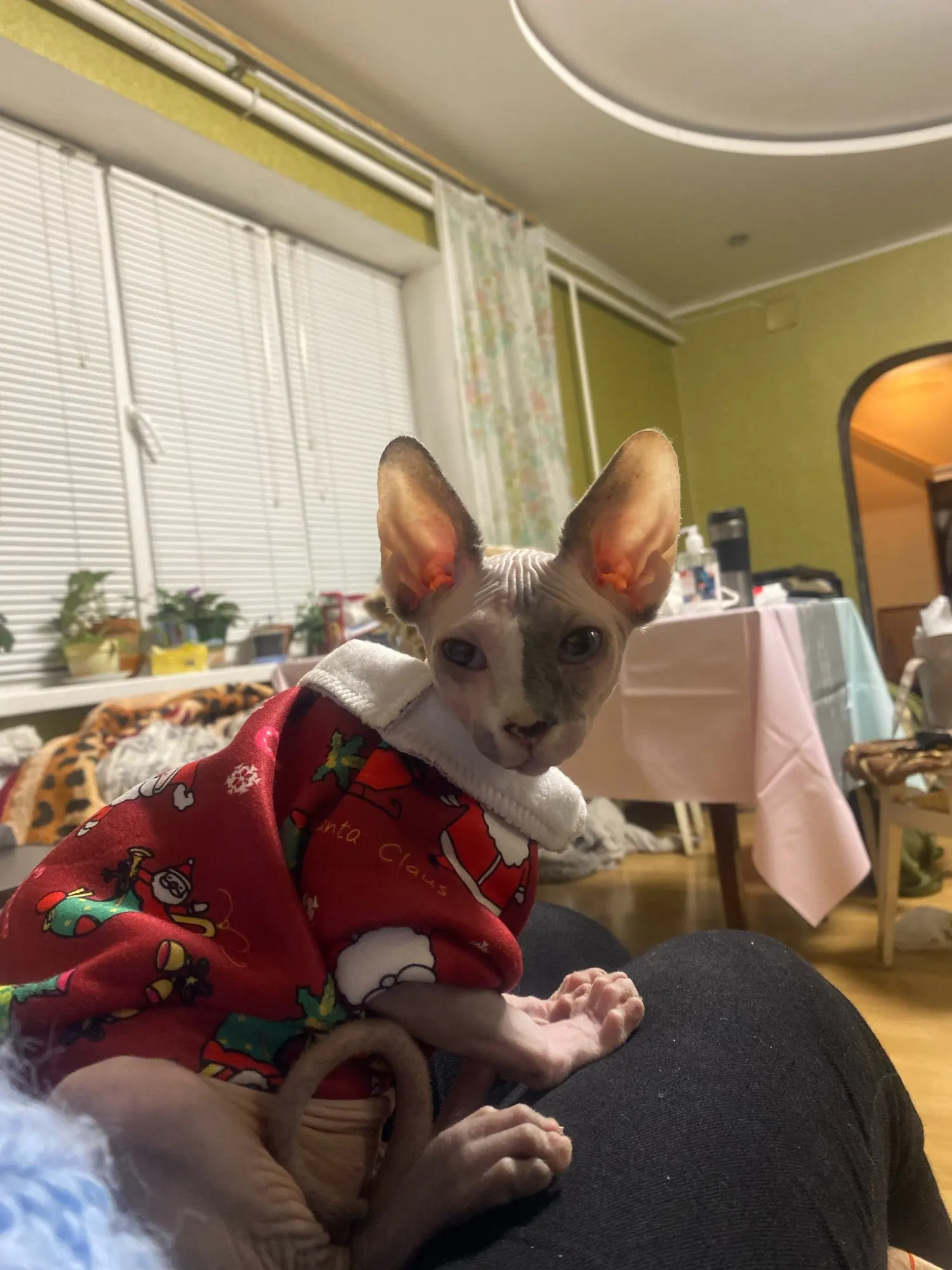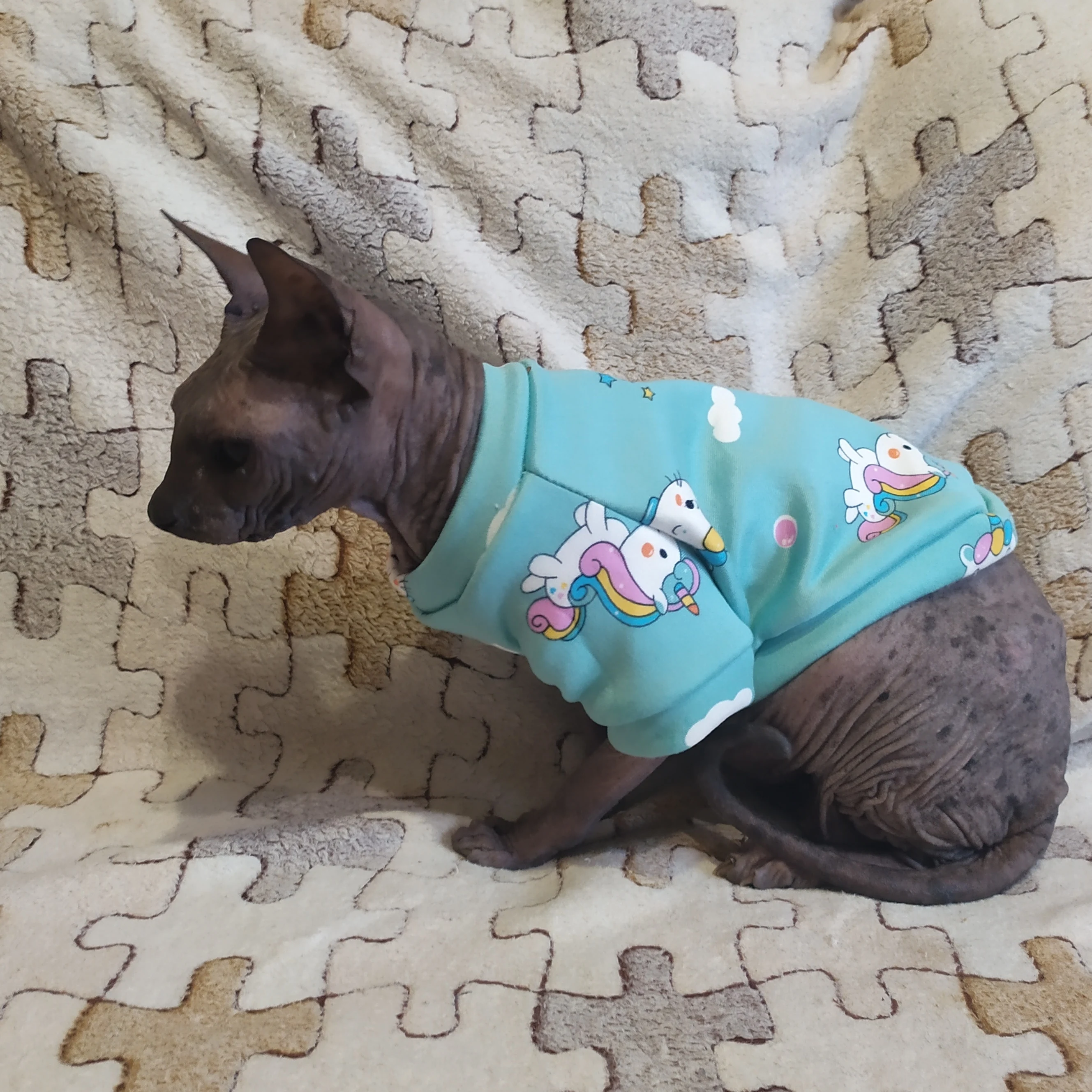Кофточки яркие, да же красивей, чем на фото! Тепленькие, с начесом. Насчет хлопка есть сомнения, но все равно хорошенькие. Размер XS на котят сфинксов от 2-х до 4-х месяцев.
