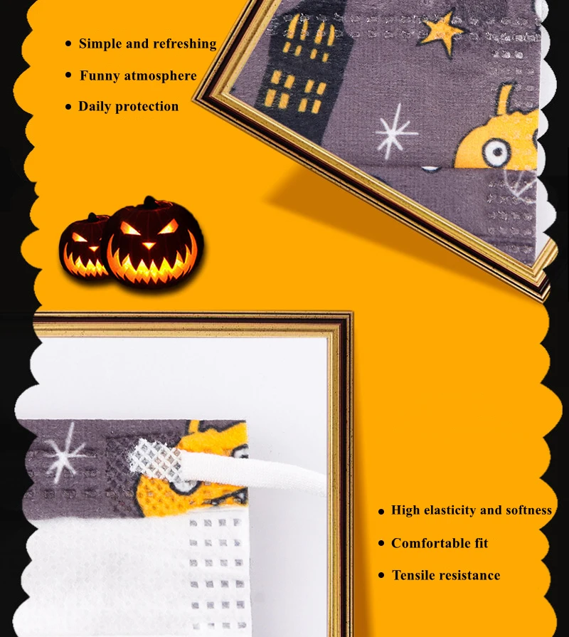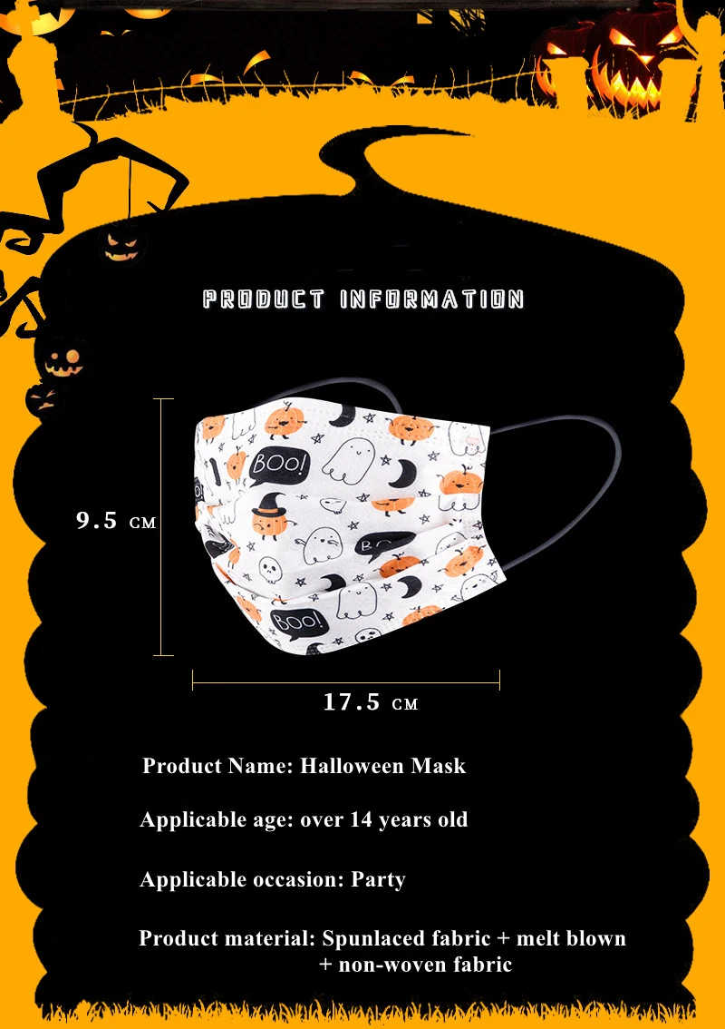 Одноразовая маска для взрослых Хэллоуин Тыква напечатанная ткань респираторные маски для лица анти-пылезащитный Masque Mascarillas Desechables Характеристики: Материал: Нетканая ткань и фильтрующий слой Тип: Ношение ушей Размер: для взрослых Применение: Повседневная жизнь, Заводская мастерская, спа, школа, рабочие места и т. Д. Указанный Товар производится и распространяется за рубежом и подпадает под действие законодательства страны его происхождения. Посылка включает в себя: 20 Вт, 30 Вт, 50/100 шт * маски Примечания: 1) маска может немного отличаться от изображений в некоторых частях, стратуре и цвете и т. д. из-за различного производственного периода и некоторых улучшений, спасибо за ваше понимание. 2) смешанные стили в продаваемой упаковке случаются иногда (но все маски имеют одинаковые функции и похожие структуры), спасибо за ваше понимание.