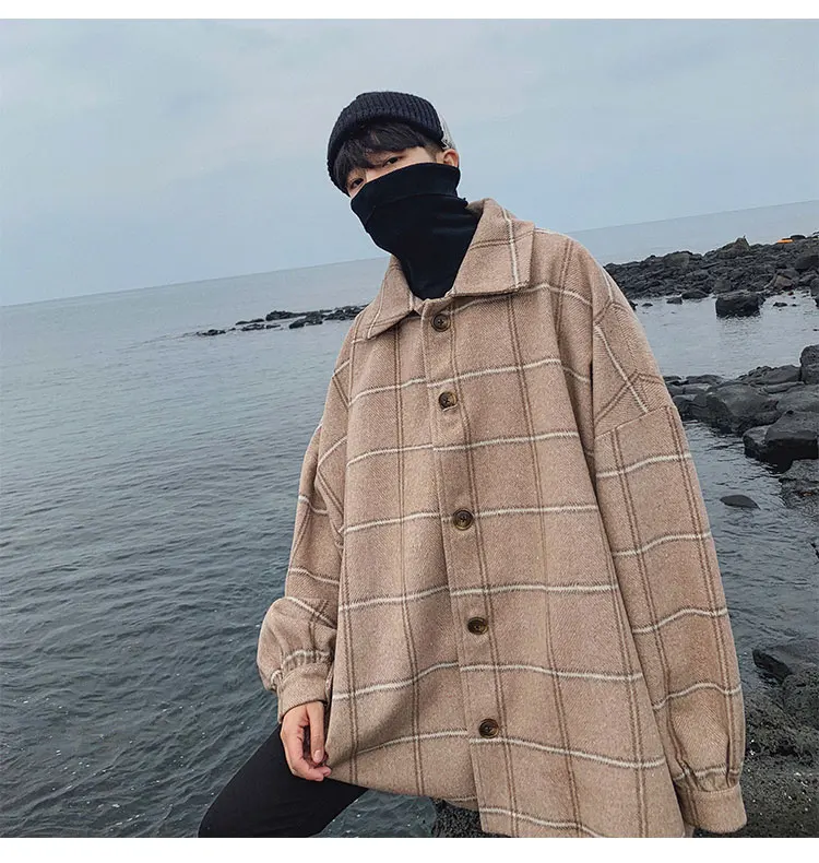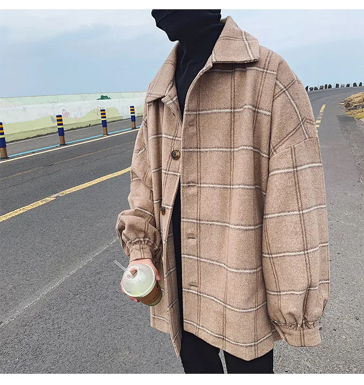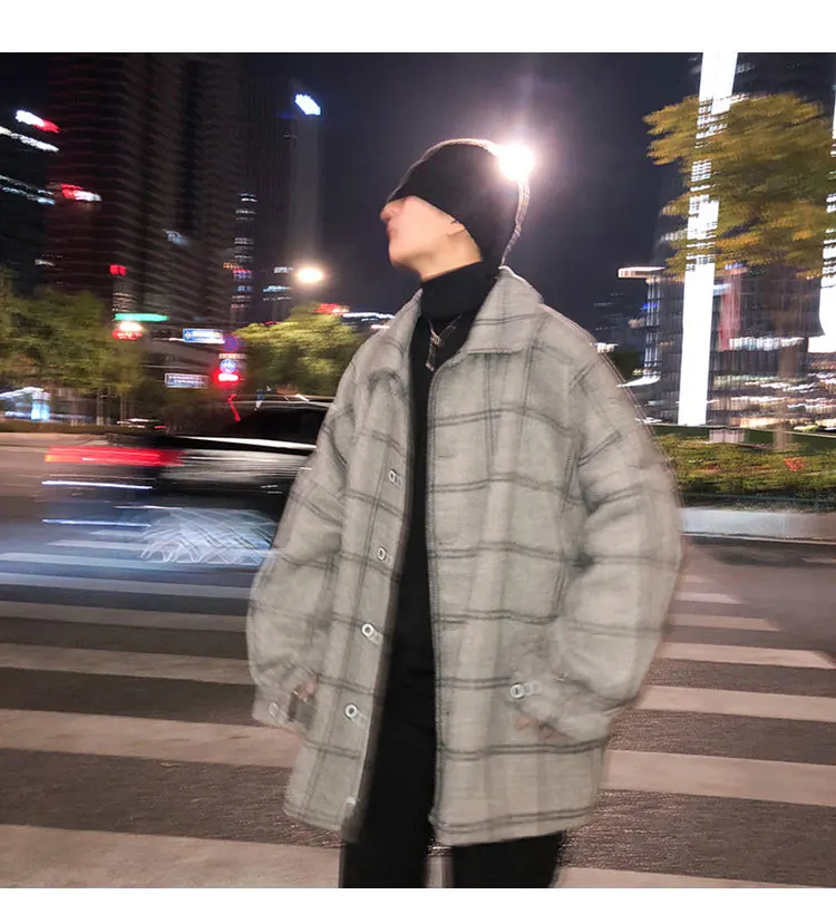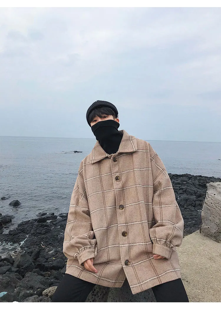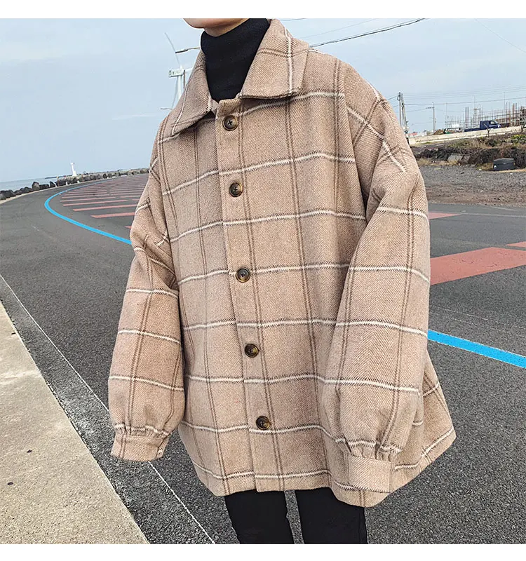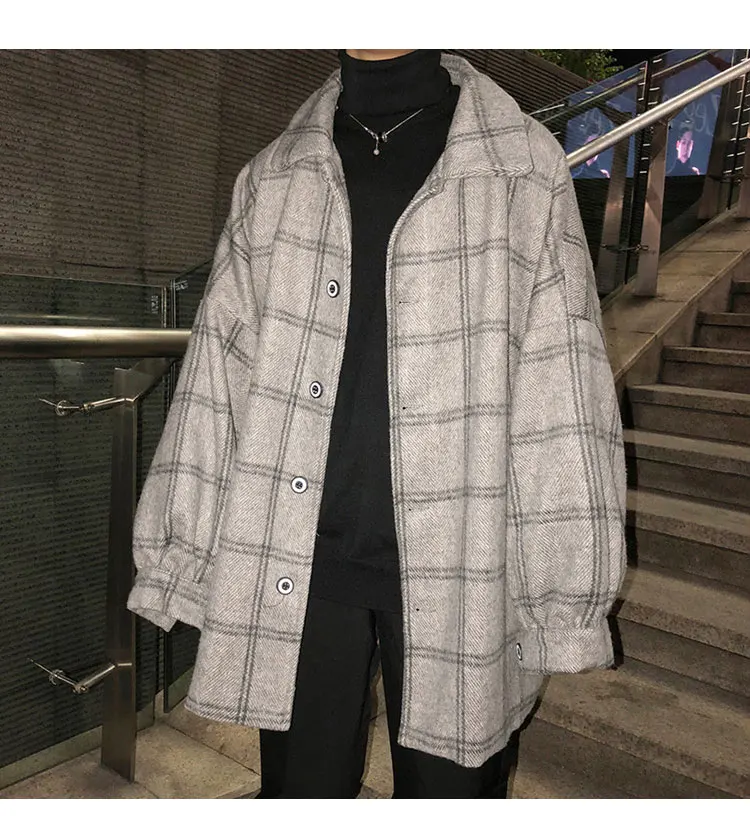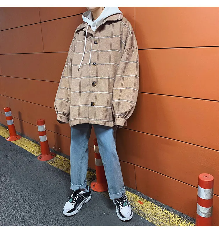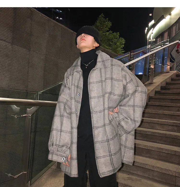 Куртка мужская шерстяная в клетку, уличная ветровка в стиле Харадзюку, большие размеры, пальто в Корейском стиле, 2021