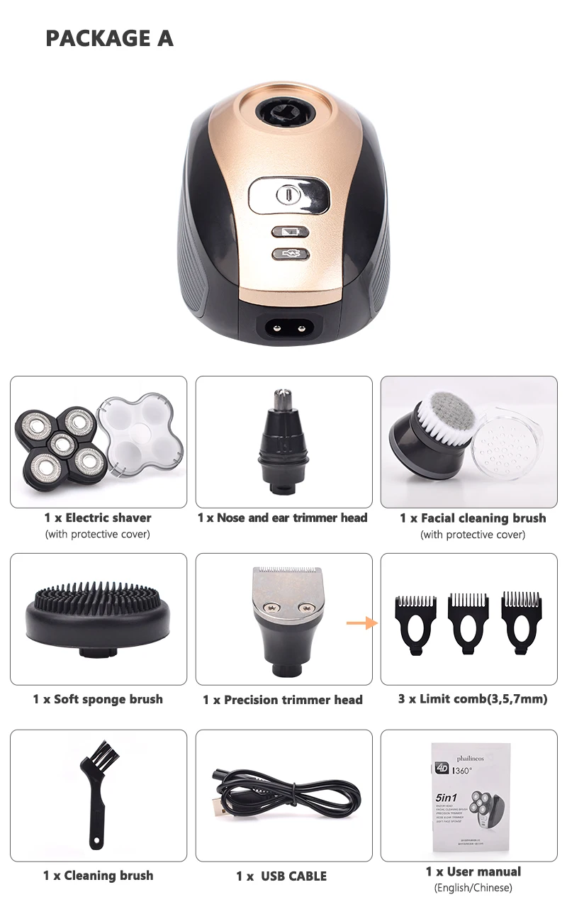 * Пять независимо плавающих головок, интеллектуальное бритье.* Он может брить вашу бороду, голову, одну машину двойного назначения, экономичный и практичный.* IPX7 водонепроницаемый, весь корпус можно стирать и чистить проточной водой.* Поставляется с всплывающим триммером, который используется для обрезки усов и бакенбардов.* 5 в 1 комплекте, кроме головки бритвы, есть Точная Головка триммера, Головка триммера для носа и ушей, мягкая губка для лица и щетка для очистки лица.* Прецизионная Головка триммера: Используйте вместе с тремя различными концевыми гребнями (3 мм, 5 мм, 7 мм) для обрезки, чтобы легче создать индивидуальную прическу.* Головка триммера для носа и ушей: используется для удаления носа и ушных волос.* Очищающая кисть для лица: с очень тонкой щетиной удаляет масло и грязь на коже, подходит для отшелушивающий для лица, Очищающий.* Мягкая губка для лица: массаж перед бритьем для смягчения щетины для более легкого бритья.* Перезаряжаемый дизайн, встроенный аккумулятор 600 мАч, после 5 часов полной зарядки, его можно использовать непрерывно в течение 45 минут.