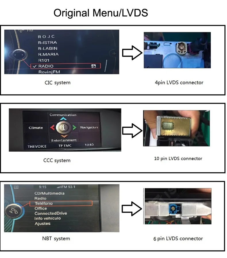 2. Прежде чем сделать заказ, пожалуйста, проверьте оригинальный стиль меню экрана и разъем LVDS, чтобы подтвердить оригинальную систему автомобиля