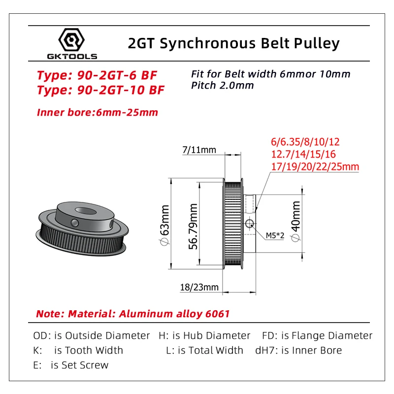 Model Number90teeth 2GT pulley bore 6mm-25mm for belt width 6mm/10mm