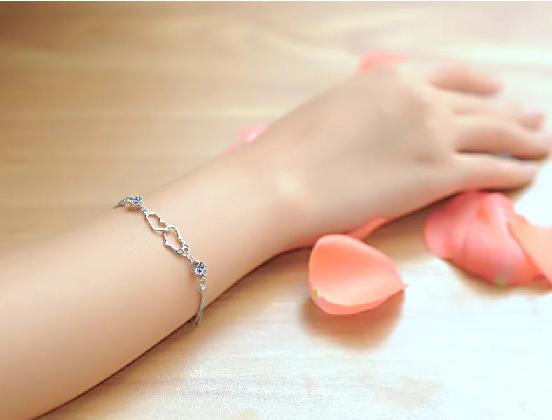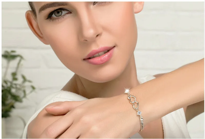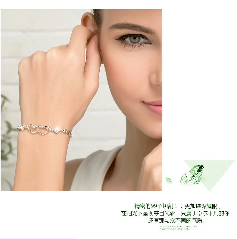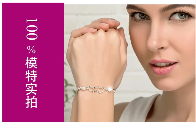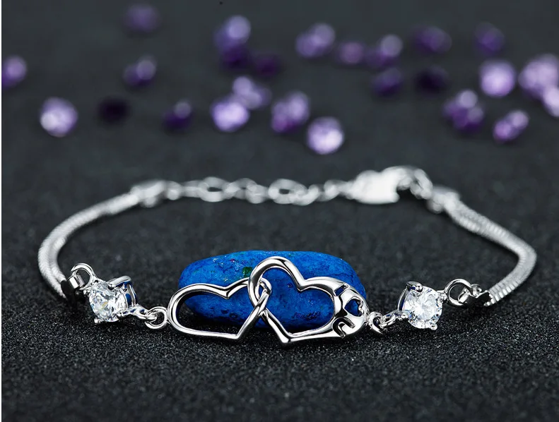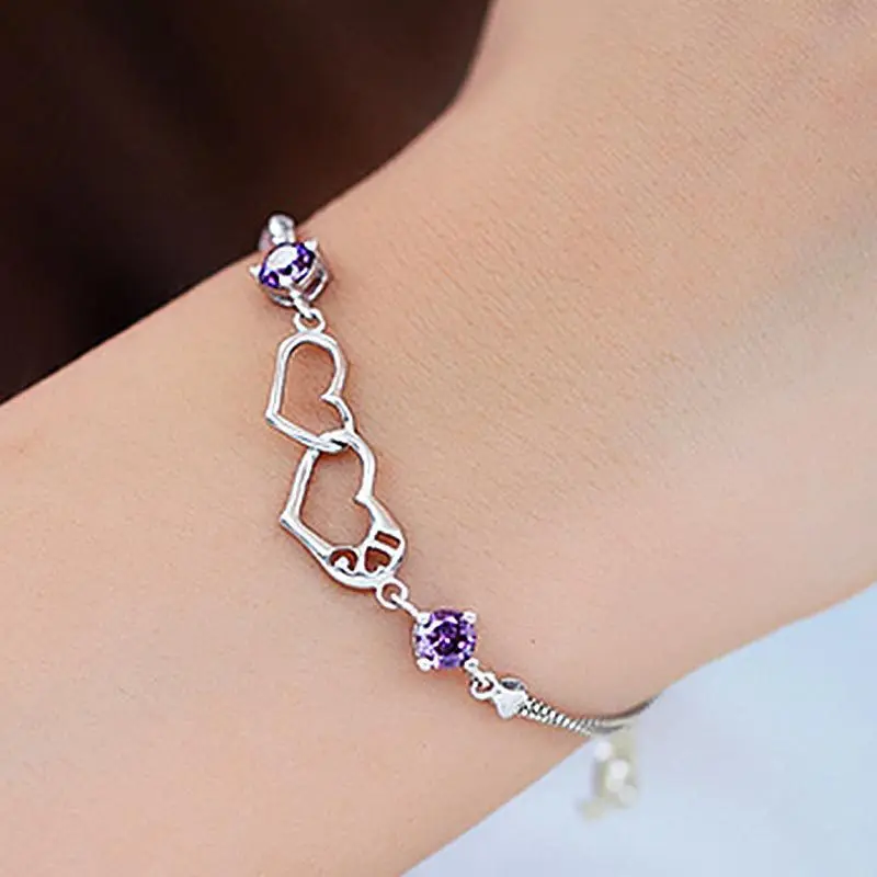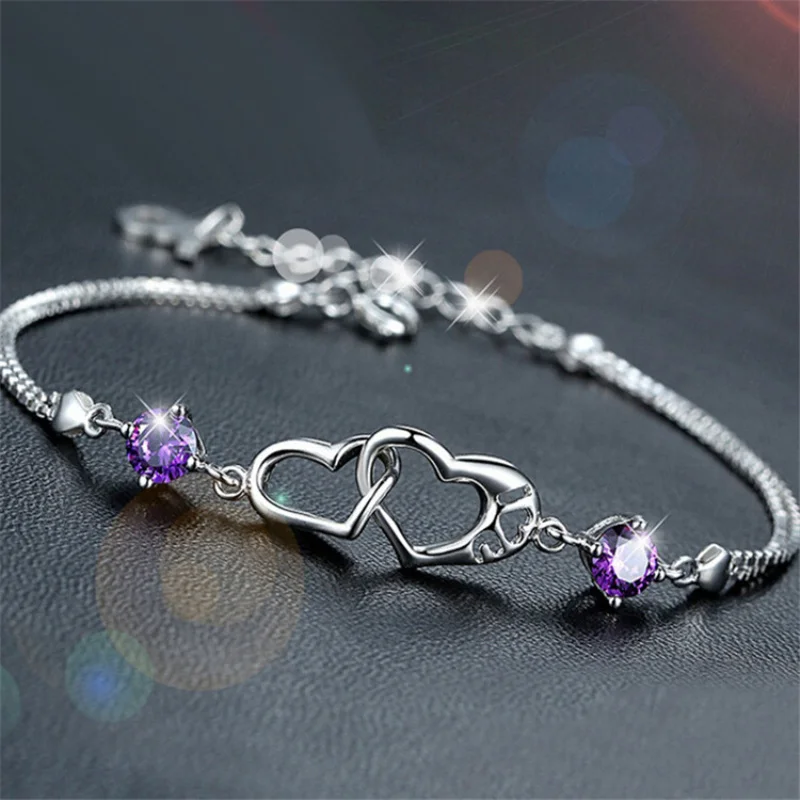Женский браслет с двойным сердцем, элегантный браслет из серебра 925 пробы с фиолетовыми бриллиантами в японском и корейском стиле, Подарочная бижутерия