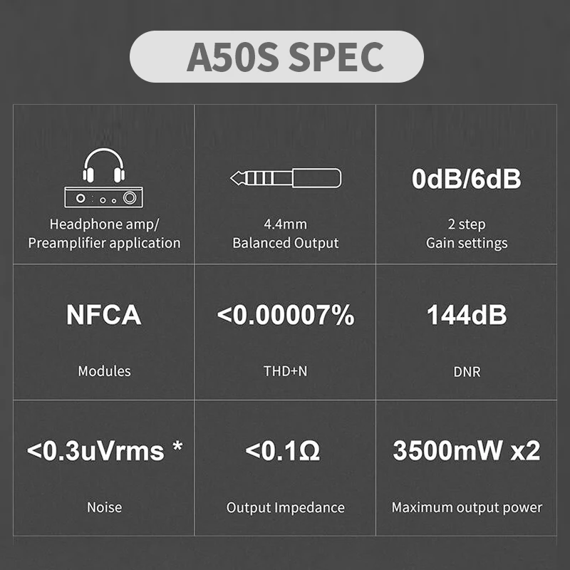 A50s использует тот же NFCA (вложенные отзывы, композитный усилитель) модуль от флагмана A90. Гибридные отзывы по напряжению и технологии UHGF (ультра высокий коэффициент усиления отзывы) обеспечивают отличную производительность постоянного и переменного тока. Высокая Выходная сила тока позволяет усилителю легко управлять наушниками с низким сопротивлением. Ультра-низкий уровень шума 0.3uV находится в милях впереди соревнований, обеспечивая абсурдно высокий динамический диапазон 144дб и отсутствие звукового шума и самого темного фона для самых чувствительных IEMs.6,35 мм SE & 4,4 мм сбалансированный выходХотя есть только односторонний вход, A50s имеет встроенный сбалансированный усилитель цепи. Поэтому он может управлять несимметричный наушники 6,35 мм выход и езды на автомобиле сбалансированный наушники 4,4 мм балансный выход.Отличный усилитель