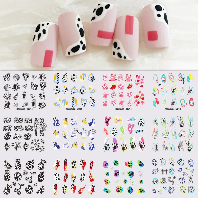 Водные Переводные наклейки для ногтей, милые переводные наклейки для ногтей с молочной коровой, сердечками, цветами, листьями, маникюр, 12 видов стилей