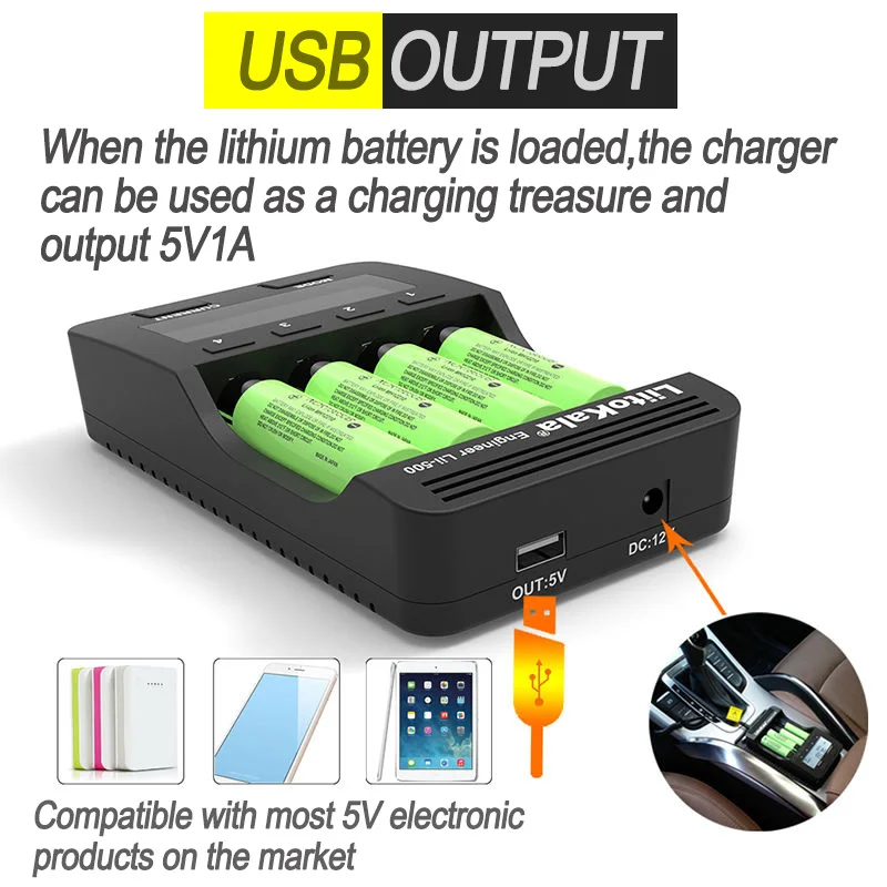 ОписаниеLii-500 Зарядное устройство: Lii-500 только Lii-500 зарядное устройствоИ адаптер: Lii-500 зарядное устройство + 12v / 2a адаптер + ИнструкцияLii-500 комплект: Lii-500 зарядное устройство + адаптер 12 В/2 А + Автомобильный Кабель 12 В + руководствоПримечание: Lii-500S результаты тестирования зарядного устройства приведены только для справки и не являются профессиональными доказательства.Вход: 12 В/2 а постоянного тока (мин.)Выходная нагрузка: li-ion 4,2 v 300ma / 500ma / 700ma / 1000ma * 4Ni-MH/cd 1,48 v 300ma / 500ma / 700ma / 1000ma * 4Предельное напряжение зарядки: 4,2 ± 0,05 v литий-ионный аккумулятор разрядкиТок на выходе: 500ma отрезной литий-ионный аккумулятор 2,8 v/никель-металл-гидридного 0,9 vНапряжение на выходе USB: 5В 1000ma (только с 3,7 в li-ion аккумулятор вставлен)Для размеров батарей: диаметр 8 мм-26 мм; Высота 34 мм-71 ммNimh / cd aaa / micro, aa / mignon, w / bady, sub-w, aLi-Ion 26650, 22650, 18650,18490, 18500,17500, 17355, 16340 (RCR123), 14500, 10440Размеры: Д * Ш * В/162*96*36 ммВес: 441 г (включая коробку)