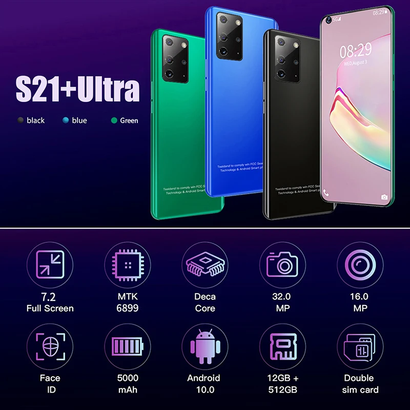 Global S21 ультра мобильные телефоны 7,2 HD дюймов глобальная версия смартфона 12 Гб RAM 512 Гб ROM Android телефон 4G/5G мобильные телефоныИнформация о продукте1. Номер модели: S21 + Ultra2. Платформа: Android 10.0 3G/4G/5G Lte3. SIM/TF: 2 слота для sim-карт (Nano SIM) + 1 слота для карт Micro SD4. Экран: 7,2 дюймов HD большая капля Экран5. Динамик: 1511 динамик6. Частота: GSM850 / 900/1800 / 1900 МГц, 3G: WCDMA850 / 2100 МГц7. Вибрация: Поддержка8. Цвет: черный/зеленый/синий9. Память: 12 Гб RAM + 512 ГБ Rom10. Мультимедиа: MP3 / MP4 / 3GP / FM радио/Bluetooth11. Камера: 16 Мп + 32 МП12. Многофункциональность: Распознавание лиц, экран отпечатков пальцев, две sim-карты, Wifi, GPS, датчик гравитации, будильник, календарь, калькулятор, видеозаписывающее устройство, видеозаписывающее устройство, WAP / MMS / GPR, просмотр изображений, электронная книга, мировые часы, задняя Миссия флэш-карта, IML задняя крышка13. Язык: Поддержка нескольких языков14. Другие: Система Android OS 10,015. Аккумулятор: литий-ионный аккумулятор 5000 мАчПосылка:1 x смартфон,1 x адаптер зарядного устройства,1 x зарядный кабель,1 х Наушники,1 x Руководство пользователя,1 x чехол для телефона,Защитная пленка-1 шт.Внимание:Из-за разницы в светильник, в зависимости от фактического цвета телефон может быть s светильник ly отличается от экрана, и товары могут отличаться. Цветовые названия используются только для различия между индивидуальными SKUs. Пожалуйста, поймите это. Спасибо.