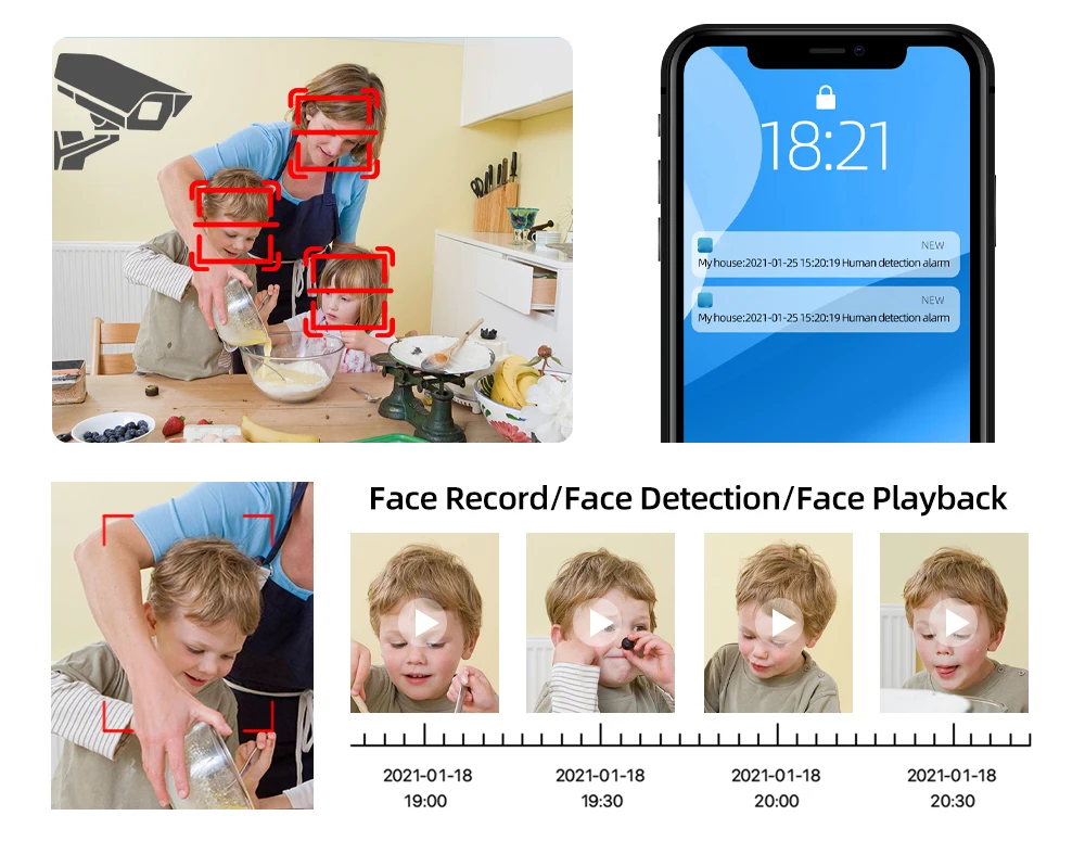 Распознавание лица, воспроизведение лица и запись лица; Быстрое снятие изображений лица и быстрое воспроизведение видео лица; Распознавание лица: автоматическое снятие изображений лица; Воспроизведение лица: интеллектуальное воспроизведение видео лица, экономия времени, не пропустите все детали;