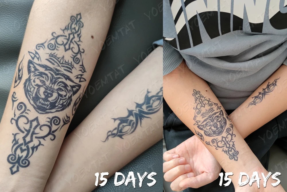 Со временем цвет татуировки постепенно темнеет, а темные точки начнут появляться. Это проявление окислительной активации пигмента после того, как растительный пигмент соприкасается с кожей, что является нормальным.