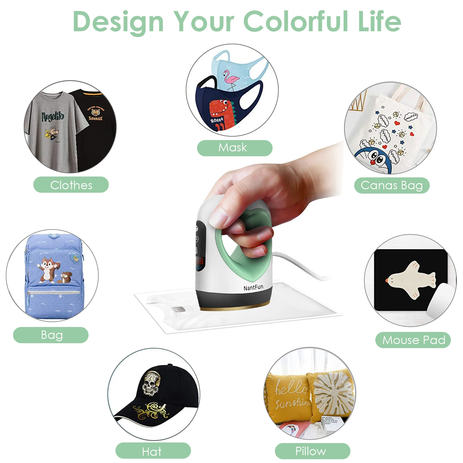 【Продуманный и широко используемый 】Маленький и легко носить с собой. Подходит для передачи фотографий или текста на футболках, одежде, сумках, Ковриках для мыши, шляпах, обуви, набивных животных и т. д. Для безопасности, пожалуйста, подождите пока он полностью остынет, прежде чем хранить. Будет звуковой сигнал при нагревании до установленной температуры, И он автоматически отключится, если не начнет работать через 30 минут.