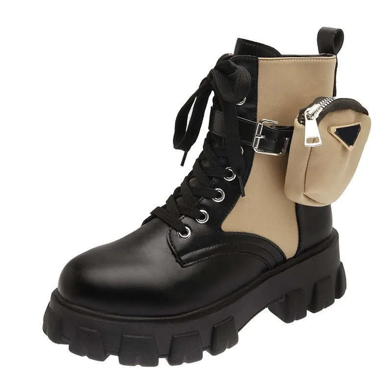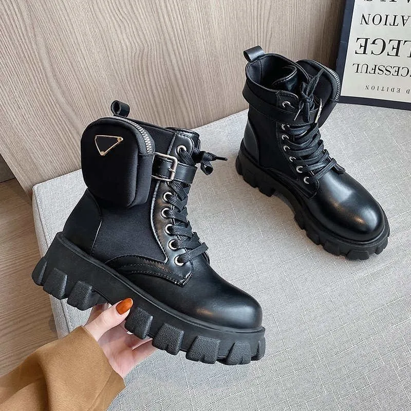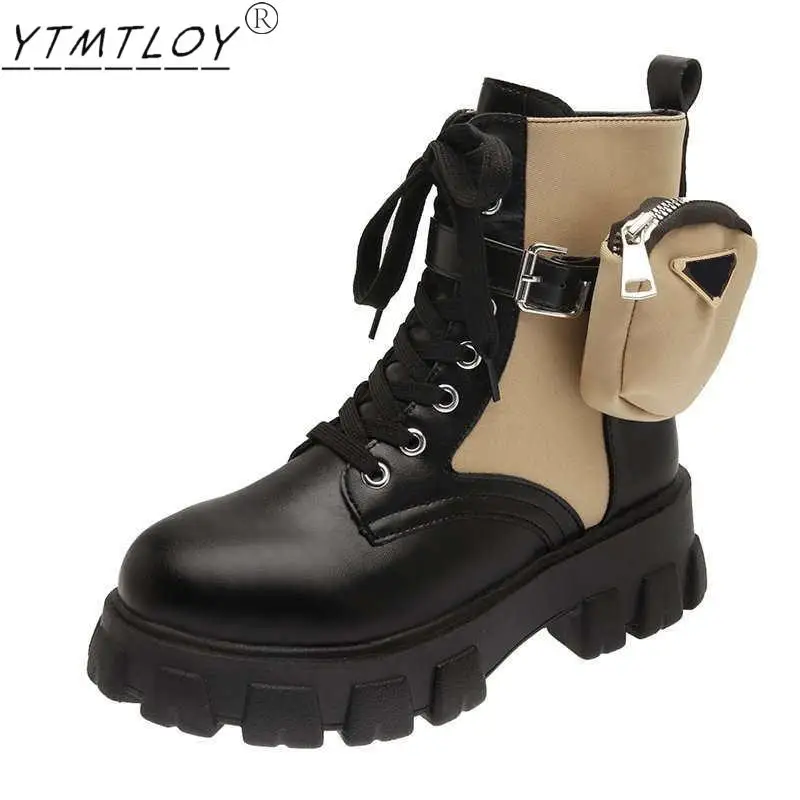 Женские ботинки с карманами, ботильоны на шнуровке, с пряжкой и ремешком, Модные Черные ботильоны на толстой подошве, зима 2022