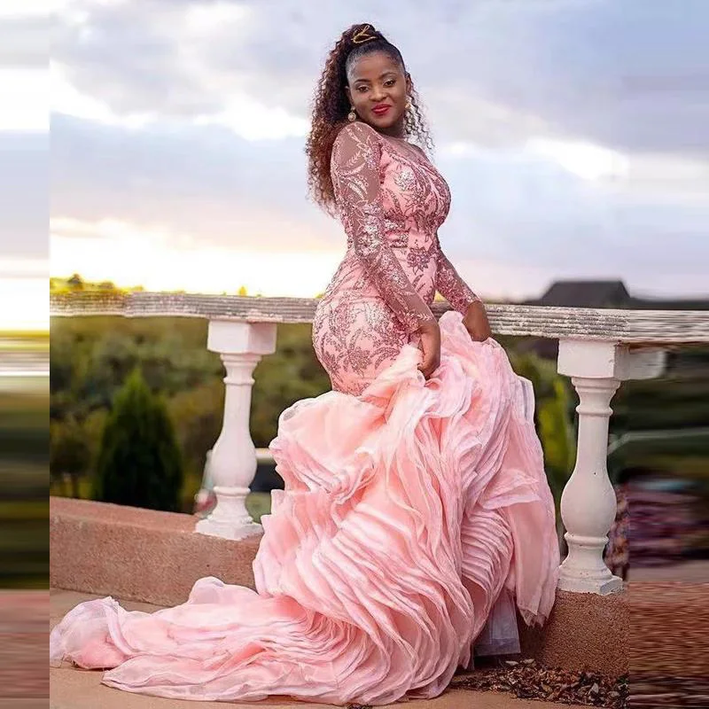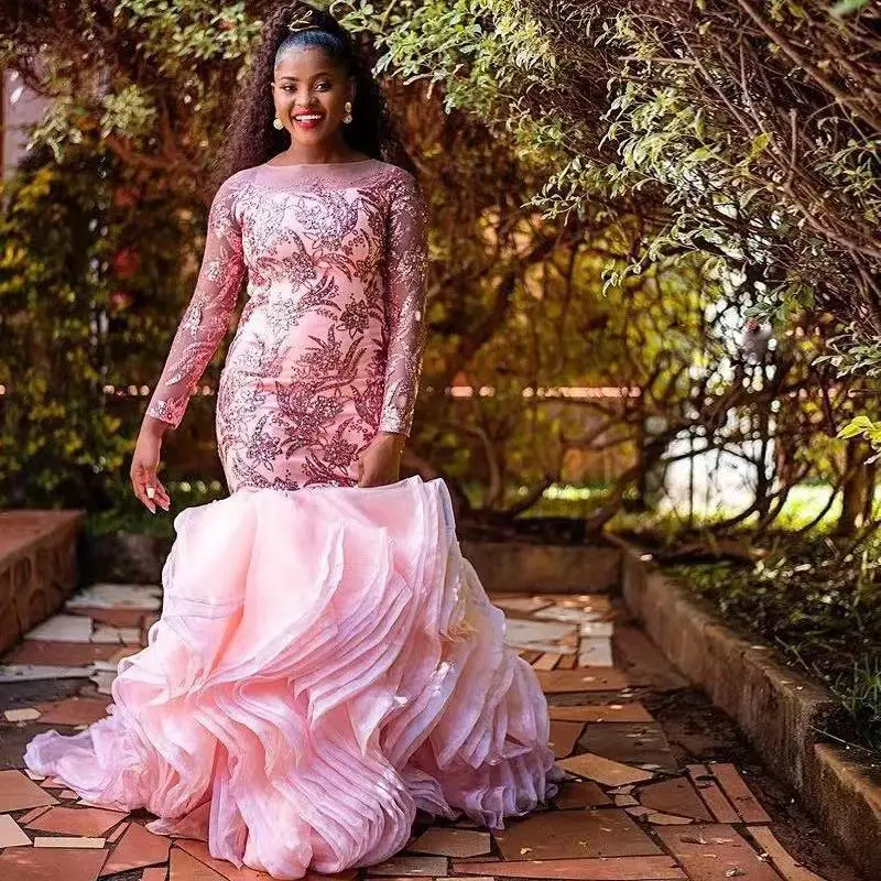 Женское вечернее платье с юбкой годе, розовое платье в нигерийском стиле с длинными рукавами, блестками, аппликацией, оборками и шлейфом, платье для выпускного вечера Aso Ebi