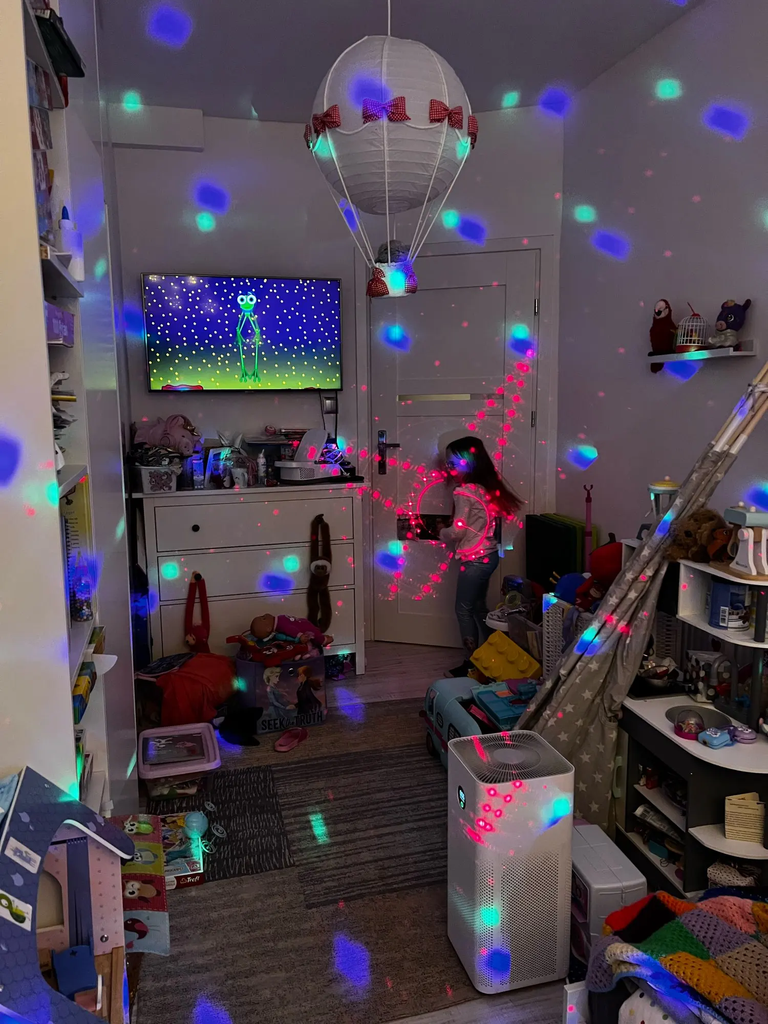 2. Пульт дистанционного управления может регулировать включение/выключение, двигатель, светодиодный светильник и лазерный светильник, переключать 3 режима работы и 3 режима воспроизведения музыки. Звук активирован, вспыхивает в ритме музыки, создавая фантастическую tmosphere. Просто наслаждайтесь 3. Красочная ночь!