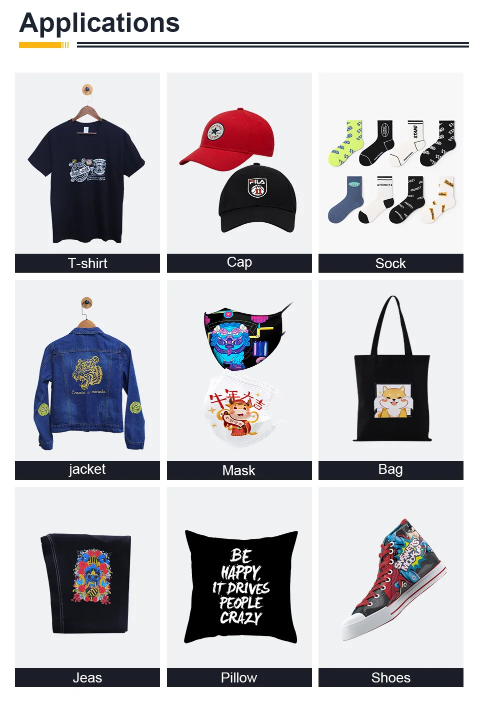 Он может напечатать футболку, кепку, носок, куртку, маску, сумку, джинсы, подушку, обувь и так далее.
