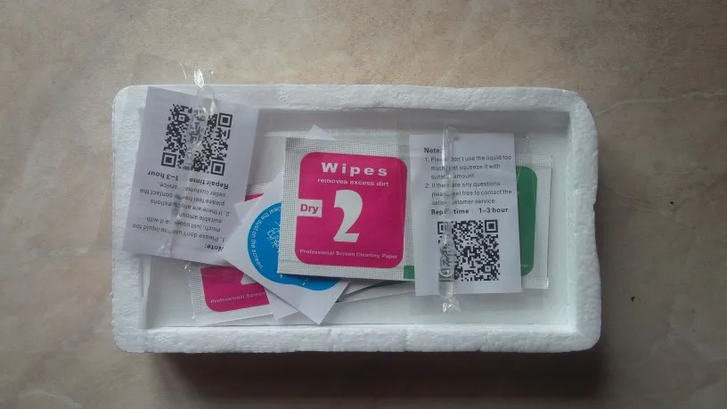 Со стеклом влажные и сухие салфетки и жидкость для вытягивания воздушных пузырей.