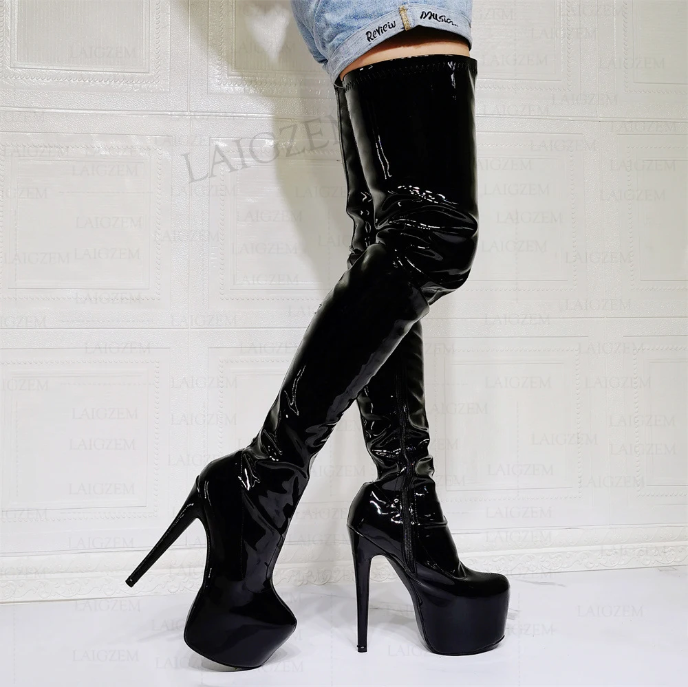 SEIIHEM/женские сапоги до бедра на высокой платформе; Сапоги выше колена на шпильке; Блестящая Черная Женская обувь; Sapato; Женская обувь; Большие размеры 42, 47, 52