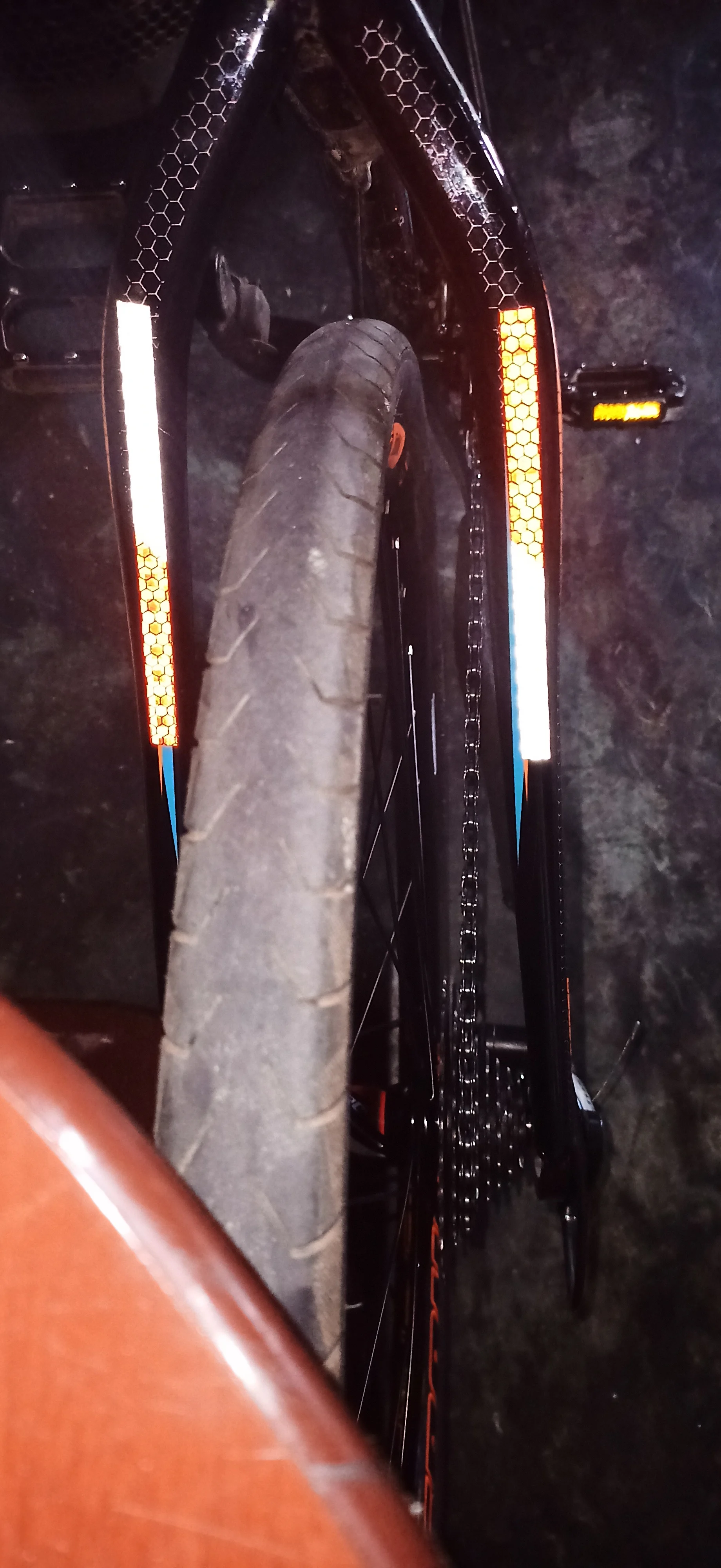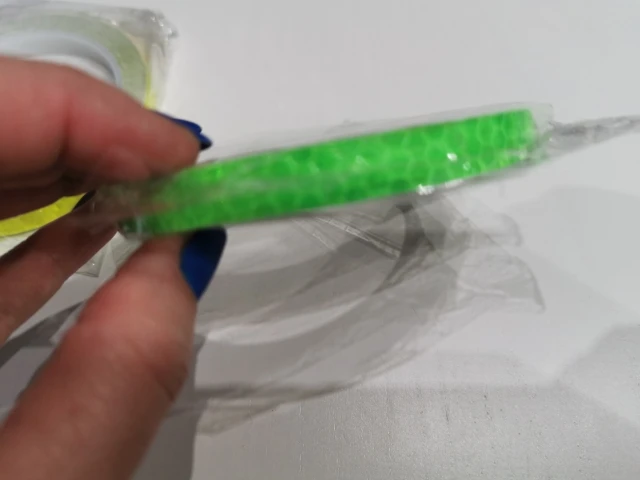 Отличная лента, только перед наклеиванием нужно как следует поверхность, а то я сглупила поначалу - протёрла ободы колёс влажными салфетками, и удивлялась почему не клеится, большой кусок ленты испортила, пришлось потом приклеивать другим клеем. Впоследствии протирала уже ватным диском смоченным в спирте и всё хорошо приклеилось. Только для наклеивания по кругу, нужно надрезы сделать. При дневном свете выглядит не очень, но в темноте отсвечивает красиво.