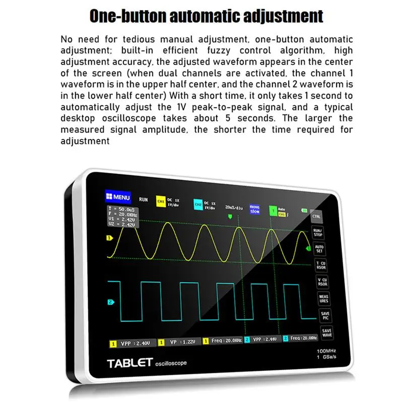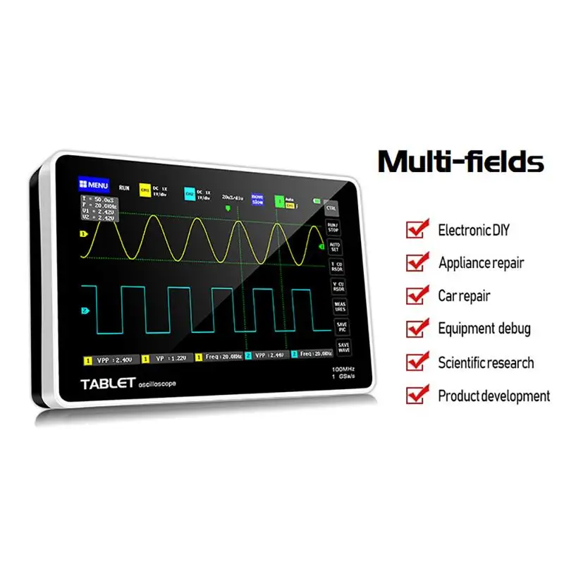 1013DХарактеристики:Название товара: цифровой планшетный осциллографЦвет: черныйАналоговая полоса пропускания: 100 МГц * 2Количество каналов: 2 каналаМаксимальная частота дискретизации в реальном времени: 1GSa/sВертикальная чувствительность: 50 мВ/див ~ 500 В/ДивГоризонтальный диапазон времени: 50S/div ~ 10NS/divМаксимальное тестовое напряжение: 40 В (1X зонд), 400 В (10X зонд)Глубина хранения: 240 кбитВходное сопротивление: 1 мТочность ADC: 8 битРежим соединения: AC/DCРежим запуска: одиночный, нормальный, автоматическийКромка триггера: поднимающаяся кромка/опускающаяся кромкаВнешнее триггерное напряжение 0-40 вДисплей: 7 дюймов-800x480Работа: емкостный сенсорный экран + жестыУдлинительные порты: экспорт изображений USBИсточник питания: литиевая батарея 6000 мАчРазмер: 184 мм x 124 мм x 50 ммОбщий вес: 650 г