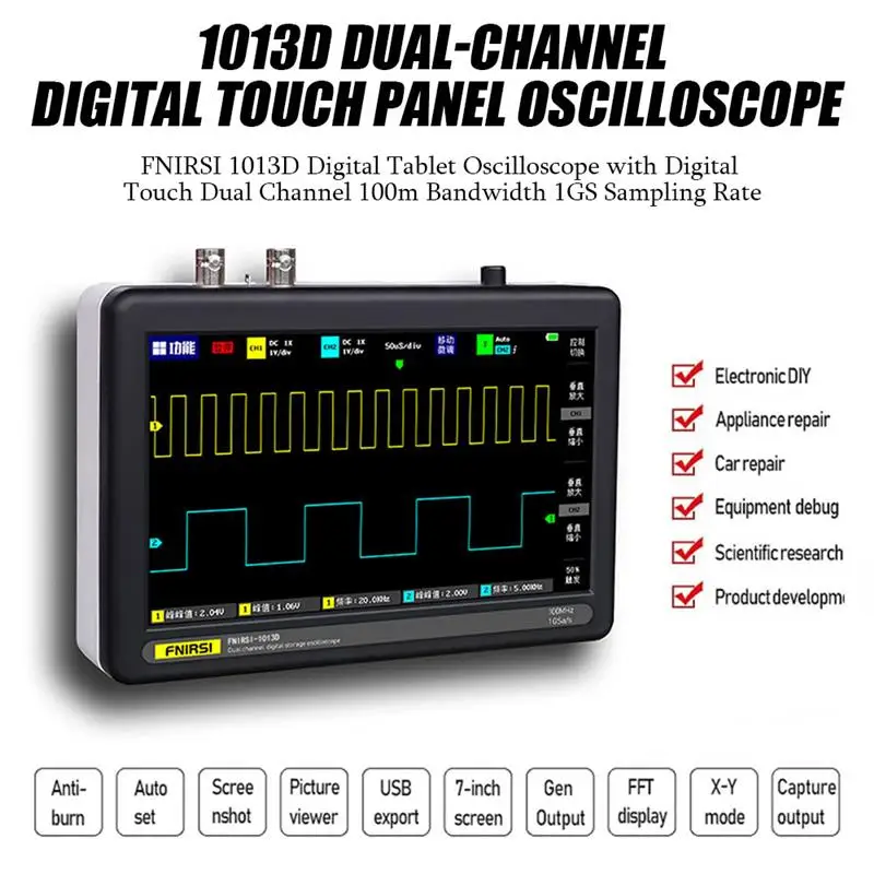 FNIRSI-1013D цифровой планшетный осциллограф двухканальный 1GS частота дискретизации 100M полоса пропускания мини планшет цифровой осциллограф 1014D