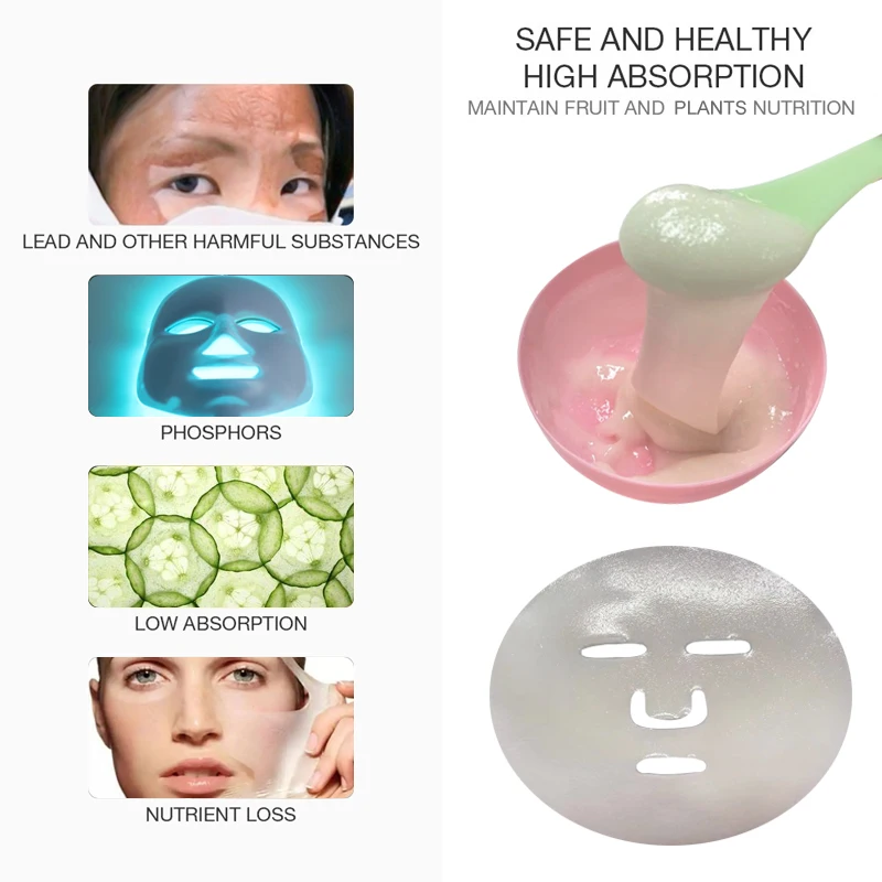 Коллаген: увлажнение и питание Укрепляющий и против морщинГиалуроновая кислота: глубокое увеличение увлажнения кожи делает кожу упругойАльгинат натрия: эффективно затягивает шелкомембрану и подтягивает контуры лицаДиатомовая земля: хорошая Адсорбция и фильтрационная способность, глубокое очищение, предотвращение черных точек и акнеКукурузный крахмал: богатый витаминами повышает эластичность и блеск кожи