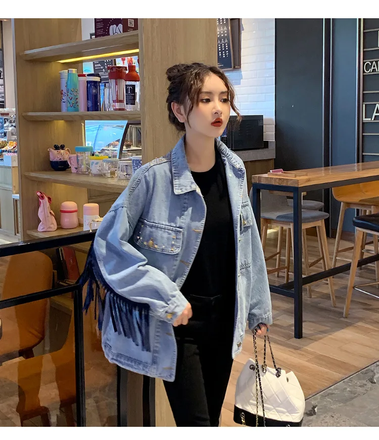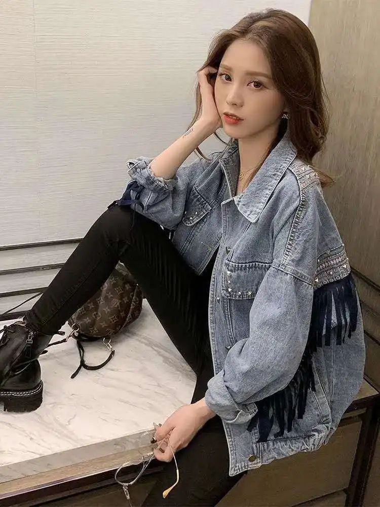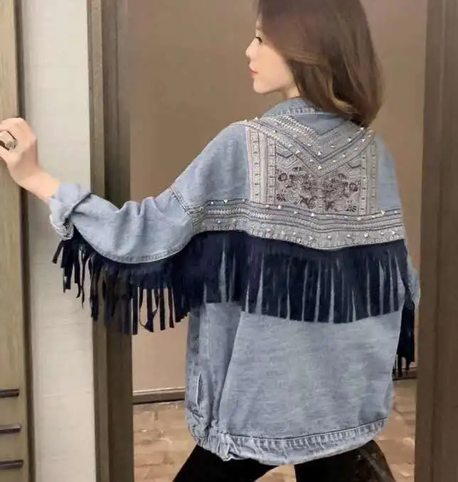 Женская джинсовая куртка ручной работы, с заклепками, кисточками и ...