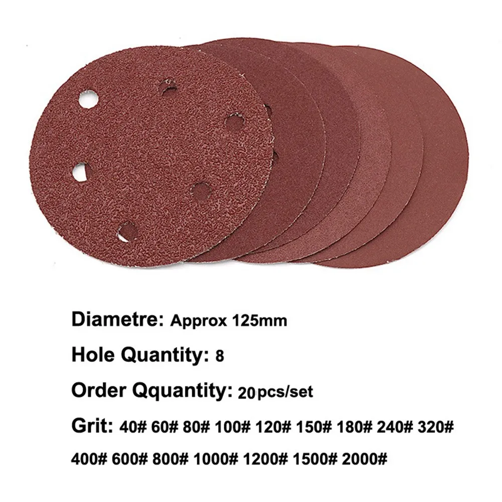 20 шт. 5 дюймов125 мм наждачная бумага круглая форма шлифовальные диски с крючком петля 8 отверстий диск шлифовальные листы Зернистость 40-2000 диск Полировальный Инструмент