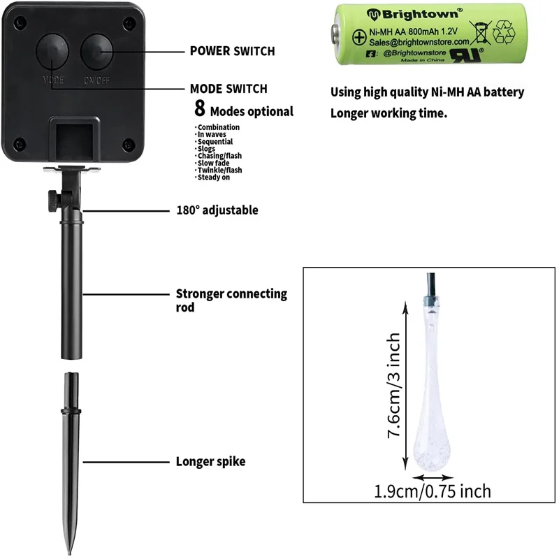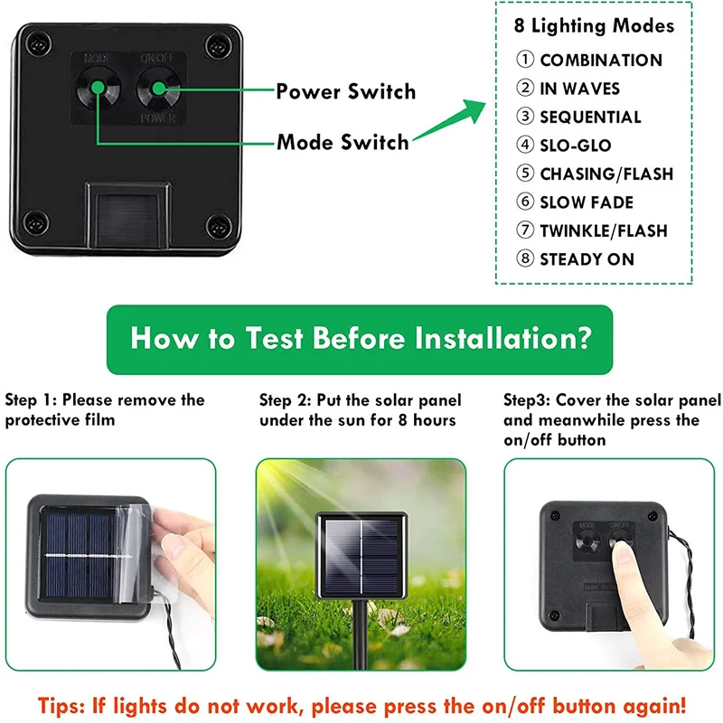 8 режимов освещения и функция памяти:Нажмите кнопку mode на солнечной панели и выберите 8 различных режимов освещения, включая волны, комбинацию, последовательный, постепенный, погоня за вспышкой, медленное выцветание, мерцание вспышки и постоянное включение. Встроенный чип памяти сохранит настройки вашего последнего режима, поэтому нет необходимости повторять настройки