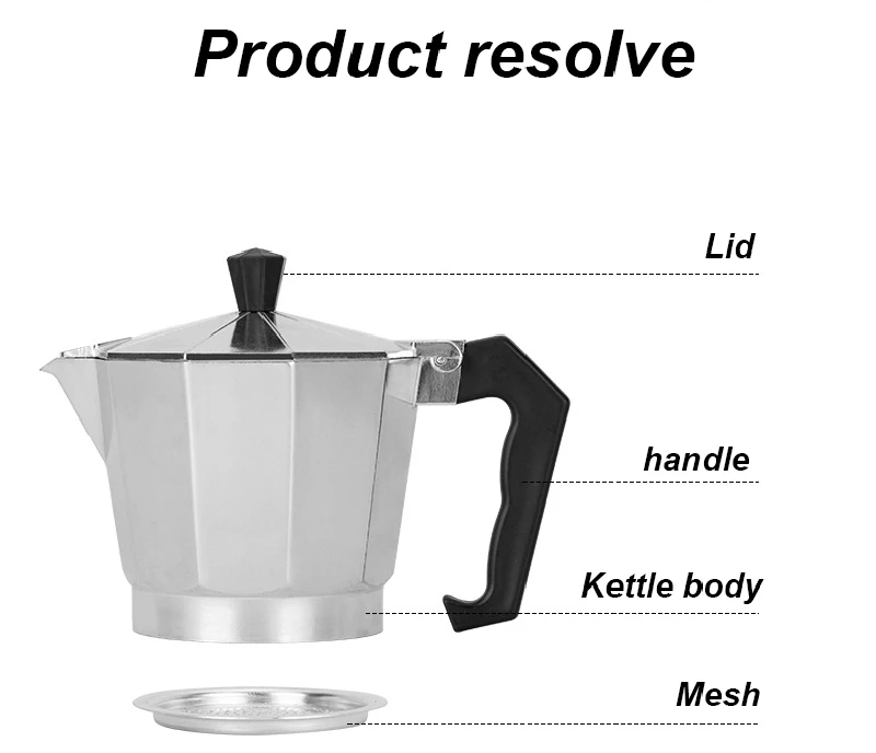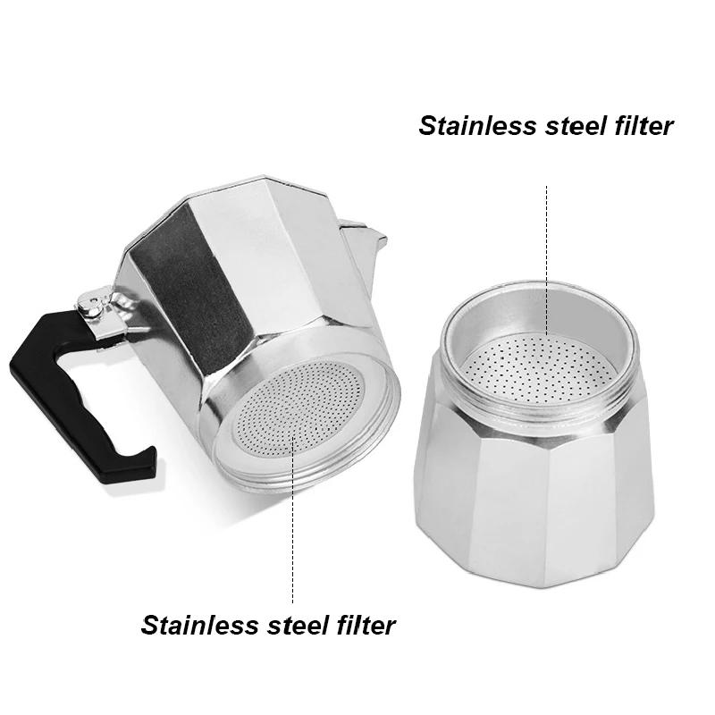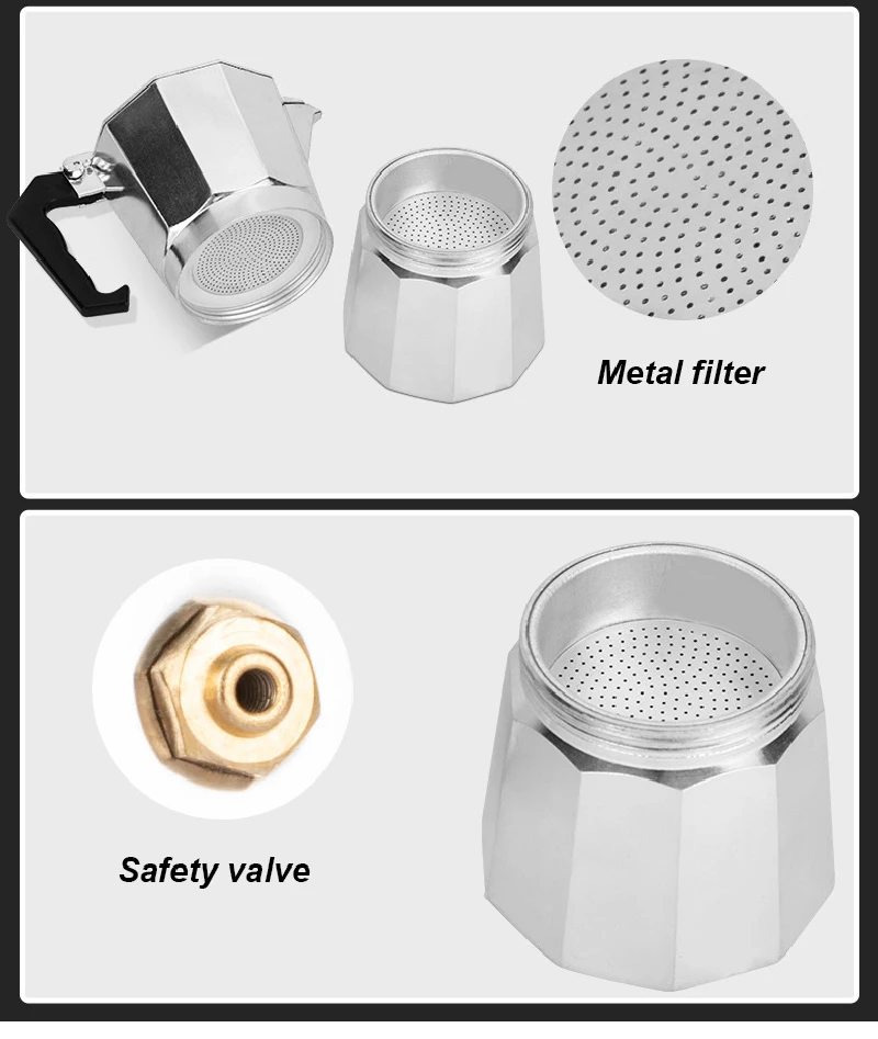 Кофейник из алюминиевого сплава изготовлен из алюминиевого сплава, с тонкой обработкой, тонкой обработкой и современной простотой. С антиобжигающей пластиковой ручкой и обтекаемой рукояткой, он чувствует себя комфортно. Металлический фильтр гарантирует качество экстракции кофе, отсутствие специфического запаха и деформации. Оснащен предохранительным клапаном для обеспечения безопасного использования заваренного кофе. Это продукт, которому вы можете доверять.