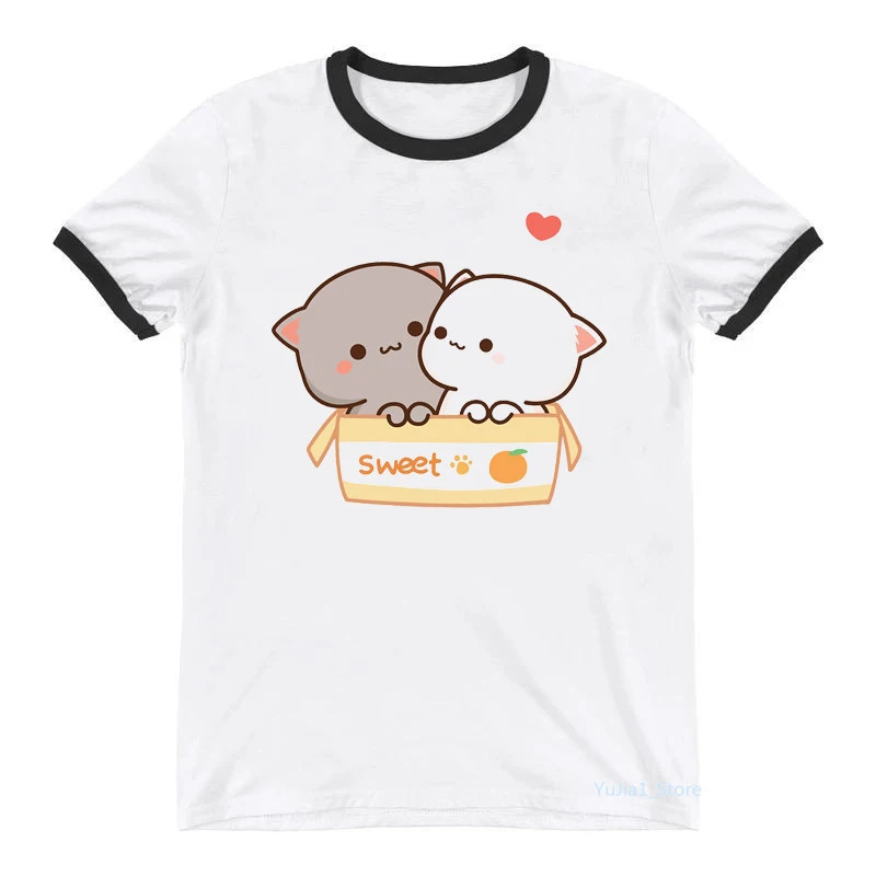 Забавные футболки, женская одежда 2021, футболка с мультяшным принтом персика и Гомы мочи и кота, Женская милая одежда в стиле Харадзюку, футболка