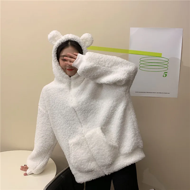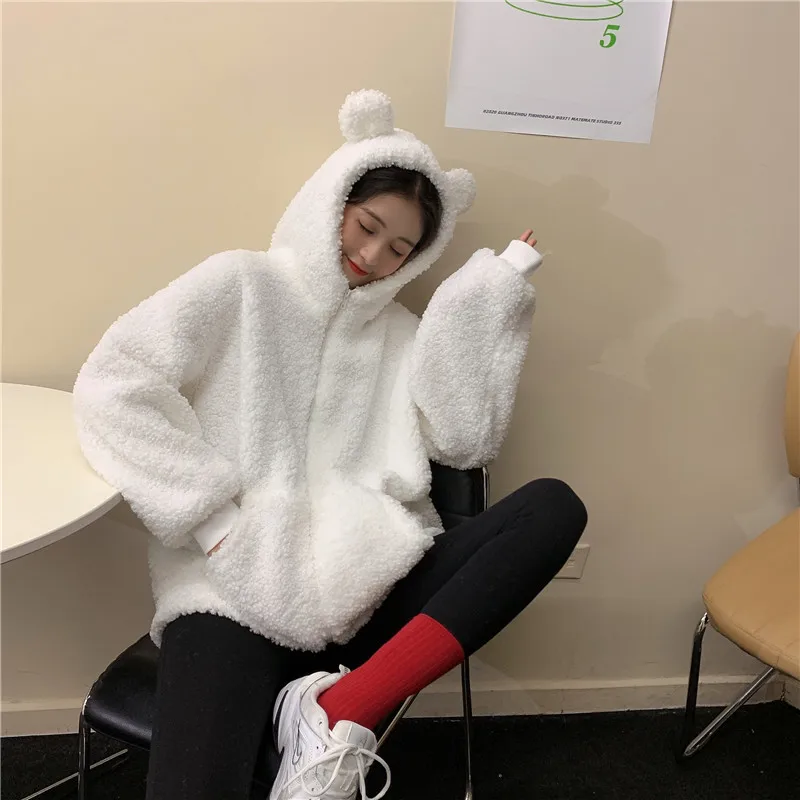 Пушистые толстовки, Женская толстовка, милая шапка с медведем, осенне-зимняя теплая куртка на молнии, мягкое флисовое пальто из ягненка, толстовка на молнии