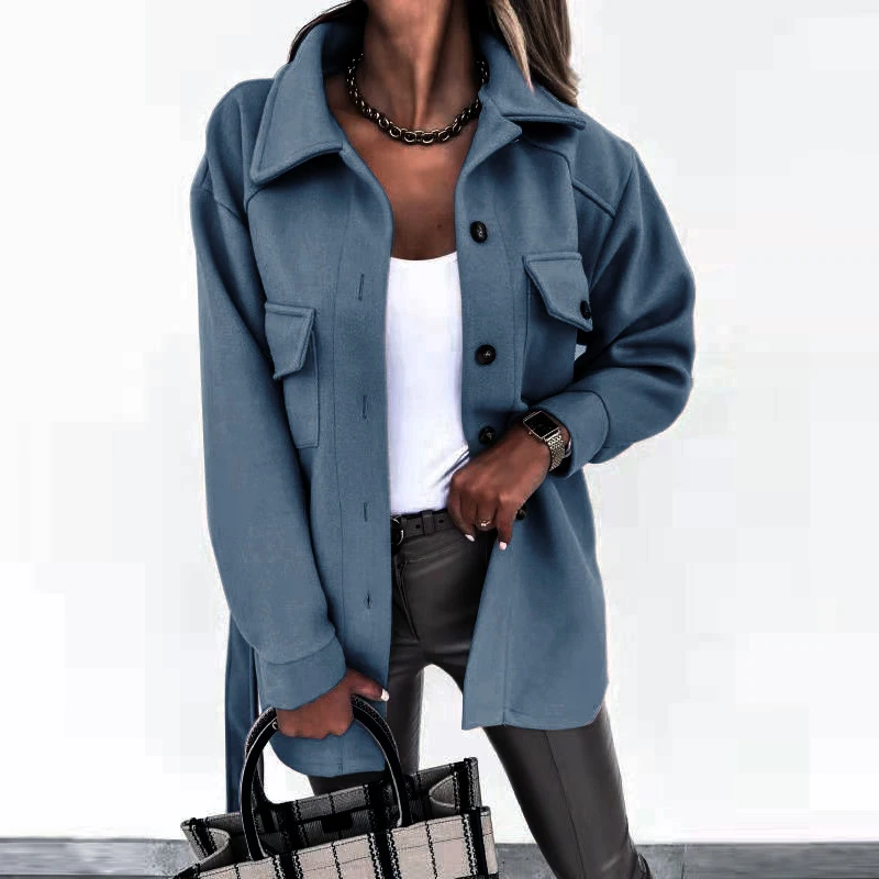 Куртка женская шерстяная однотонная, однобортная, с отворотом, с длинным рукавом, Осень-зима, 2021