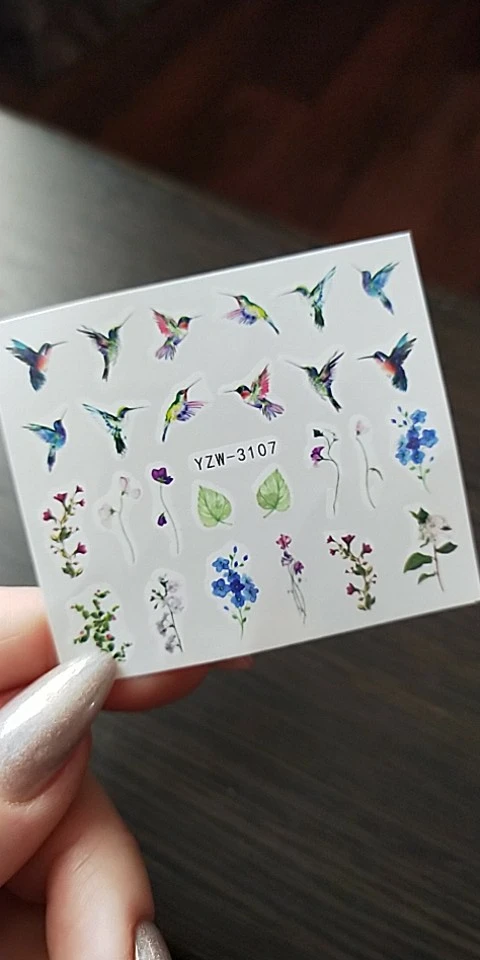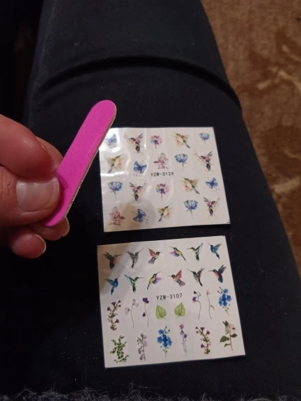 Очень нежные наклейки, пришли именно те, которые заказывала и довольно быстро. Продавец в подарок положил миниатюрную пилочку( немного погнута). С наклейками всё в порядке.