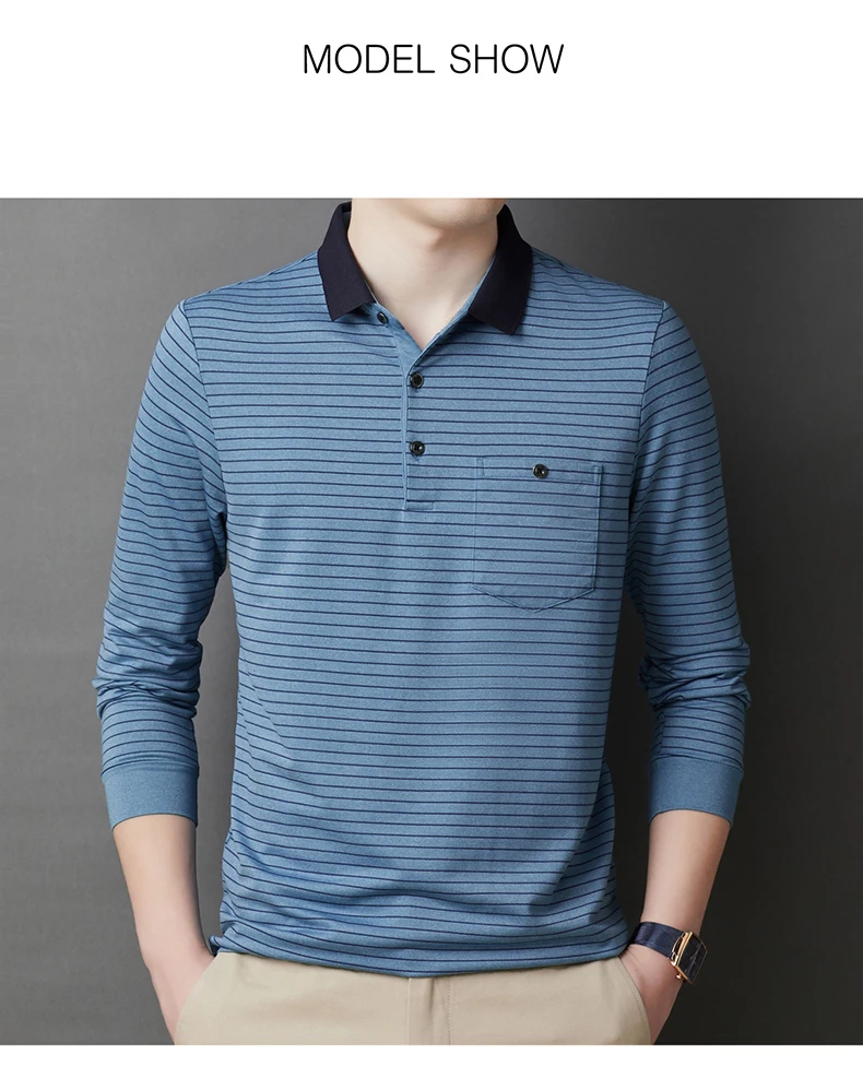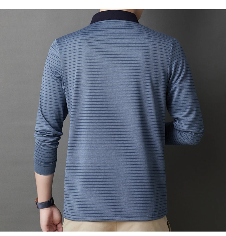 Мужская приталенная рубашка-поло с длинным рукавом, в полоску