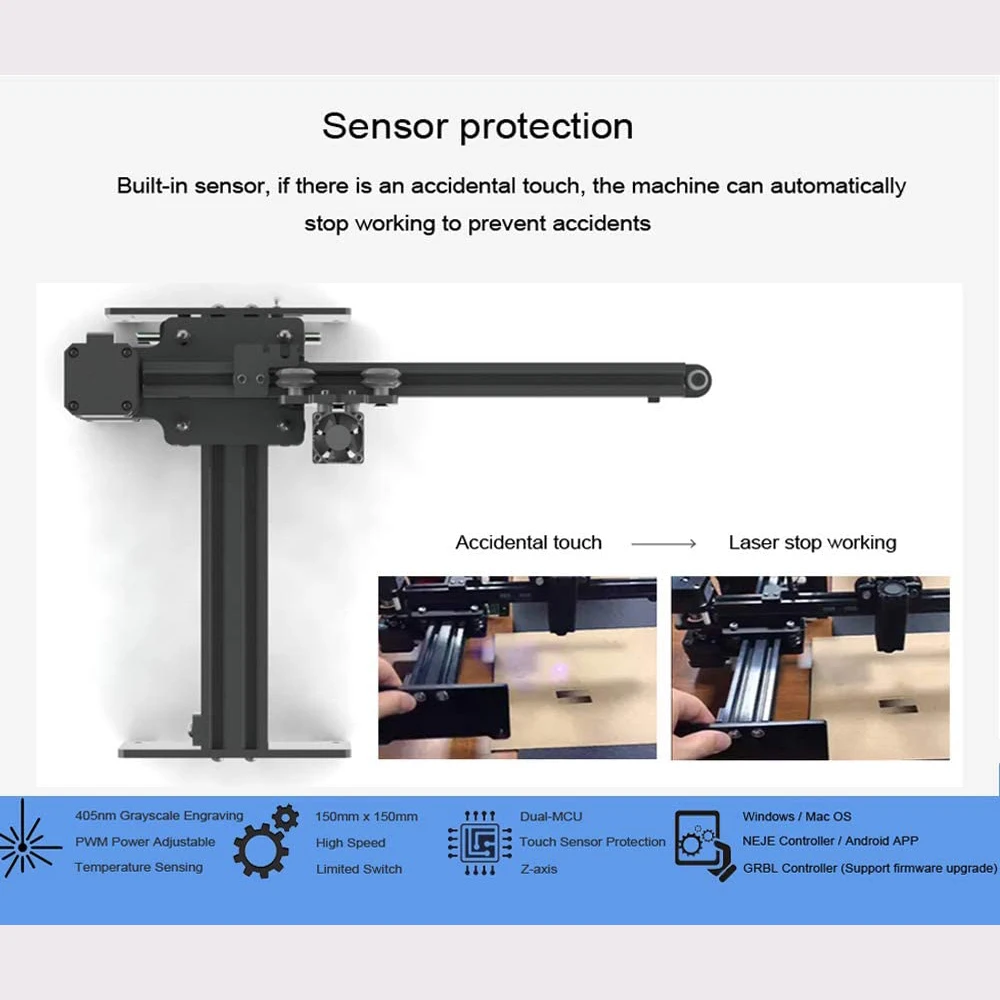 Встроенное защитное устройство гироскопа. Когда лазерный гравер работает, встроенный гироскоп будет записывать рабочее положение в начале. В случае случайного касания или машинного сдвига, машина автоматически прекратит работу, чтобы предотвратить несчастный случай.