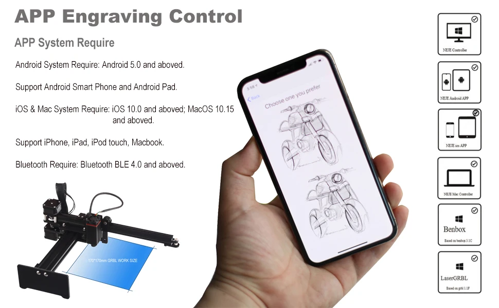 Приложение NEJE для AndroidБеспроводное приложение NEJE для iOS / macOS, windows, Benbox, LaserGRBL с прошивкой GRBL1.1f.Формат изображения: BMP. JPG. PNG. NC. DXFРазмер изображения: 2266*2266 пикселей/0,075 мм точечное расстояниеNEJE контроллер: Размер изображения: 150*150 ммКонтроллер GRBL: Размер изображения: 170*170 мм