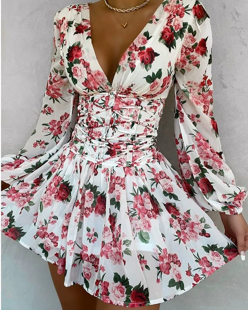 Женское элегантное пикантное Платье на шнуровке с V-образным вырезом, офисное дизайнерское мини-платье-трапеция с запахом, женское осеннее мини-платье с рукавами-фонариками, 2021