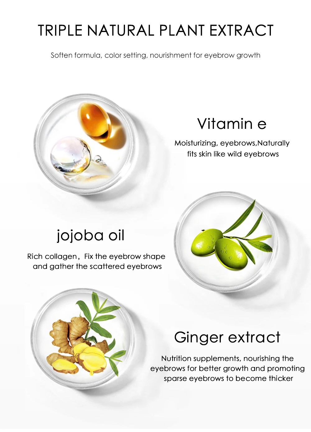 1. Экстракт имбиряПитательные добавки, питательные брови для лучшего роста и продвижения редких бровей, чтобы стать толще. Стойкие к поту, водостойкие и жироустойчивые, дающие вам длительный, освежающий и не липкий макияж для бровей2. Масло жожобаБогатый коллагеном, фиксирующий формы бровей и собирающий разбросанные волоски для бровей3. Тройной натуральный растительный экстрактСмягчающая формула, Настройка цвета, питание для роста бровей. Хорошие увлажняющие свойства, делая брови подходящими для кожи естественным образом, как дикие брови