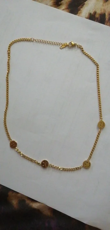 Каждый смайлик имеет разную форму, а цепочка закатывается вверх и вниз на шее.