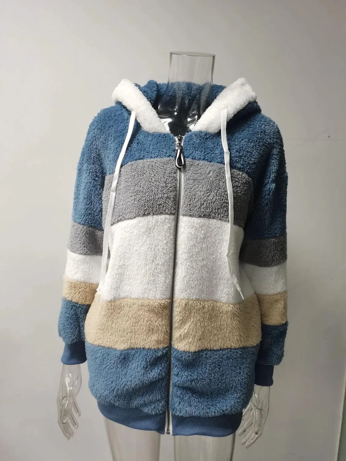 Женская плюшевая куртка с капюшоном, зимняя Свободная куртка в клетку, с карманами на молнии и длинным рукавом, в стиле пэчворк