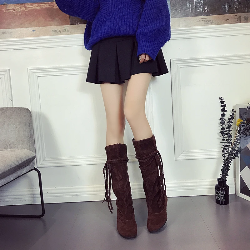 Женские сапоги на плоской подошве, с бахромой, до колена, Размеры 3...