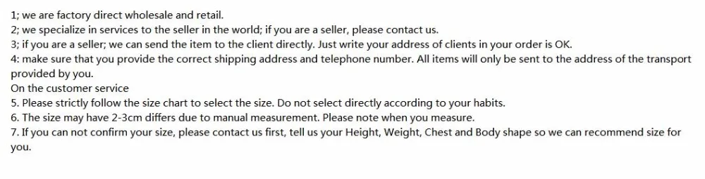 1. Мы являемся фабрикой оптом и в розницу. 2. Мы специализируемся на услугах для продавца в мире; Если вы продавец, пожалуйста, свяжитесь с нами. 3. Если вы продавец; Мы можем отправить товар непосредственно клиенту. Просто напишите свой адрес клиентов в вашем заказе. 4: Убедитесь, что вы указали правильный адрес доставки и номер телефона. Все товары будут отправлены только по указанному Вами адресу. В службе поддержки клиентов 5. Пожалуйста, строго следуйте таблице размеров, чтобы выбрать размер. Не выбирайте напрямую в соответствии с вашими привычками. 6. Размер может отличаться на 2-3 см из-за ручного измерения. Пожалуйста, обратите внимание при измерении. 7. Если вы не можете подтвердить свой размер, пожалуйста, сначала свяжитесь с нами, сообщите нам ваш рост, вес, грудь и форму тела, чтобы мы могли рекомендовать вам размер.