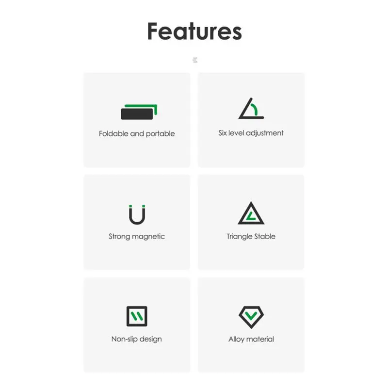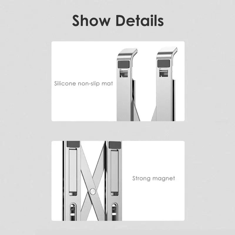Размер упаковки: 25*5,5*2,5 смЕдиничный продукт: 230 гПункт продажи:1. Технология обработки ЧПУ, все металлические материалы! Новый внешний вид, тоньше и легче! С магнитным дизайном, хранилище в один клик! Бесплатная Сумка для хранения.2. Легкий, портативный, складной3. Шестискоростная регулировка, поддерживающая комфортную регулировку от (минимум) 55 мм до (максимум) 105 мм.4. Материал из алюминиевого сплава и треугольная конструкция более стабильны и надежны.5. Полая конструкция рассеивания тепла внизу, более быстрое и безопасное рассеивание тепла6. Сочетание сильного магнита и нескользящего силикагеля делает адсорбцию нескользящей сильнее